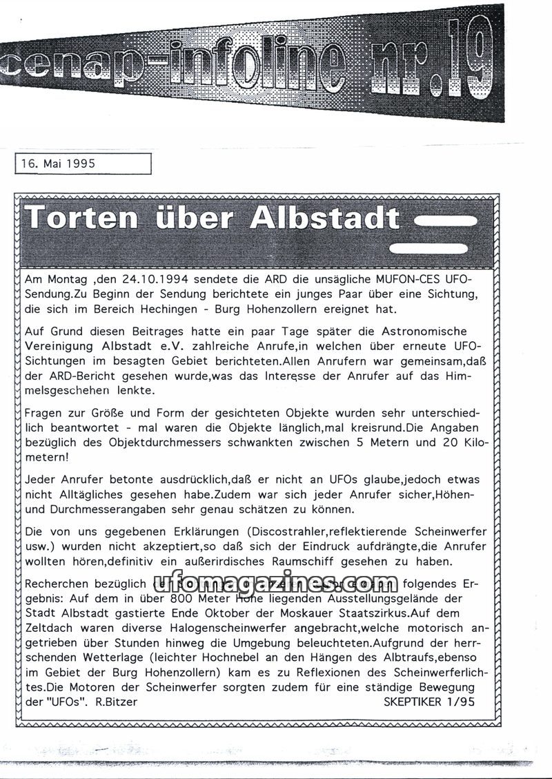This issue of cenap-infoline discusses UFO sightings over Albstadt, Germany, following an ARD broadcast. While witnesses described unusual objects, a skeptical explanation points t