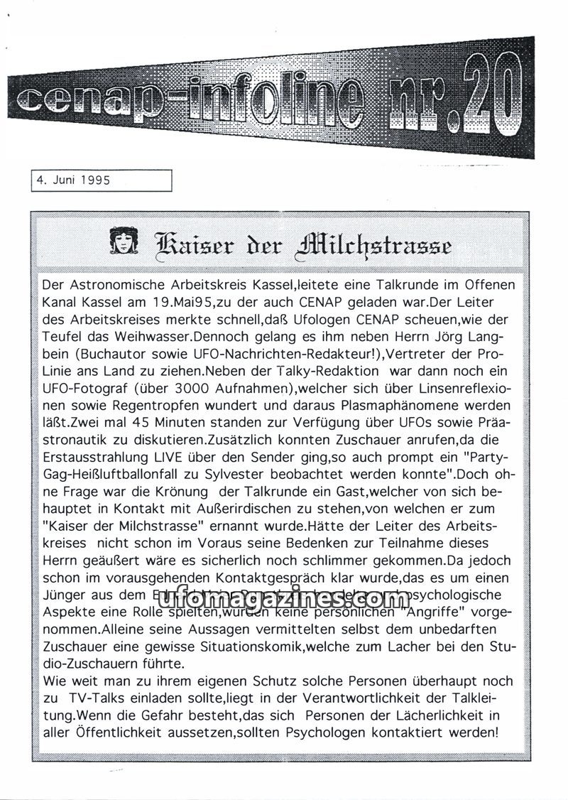 This issue of cenap-infoline covers a talk round in Kassel on May 19, 1995, where UFOs and pre-astronautics were discussed, including a guest claiming contact with extraterrestrial
