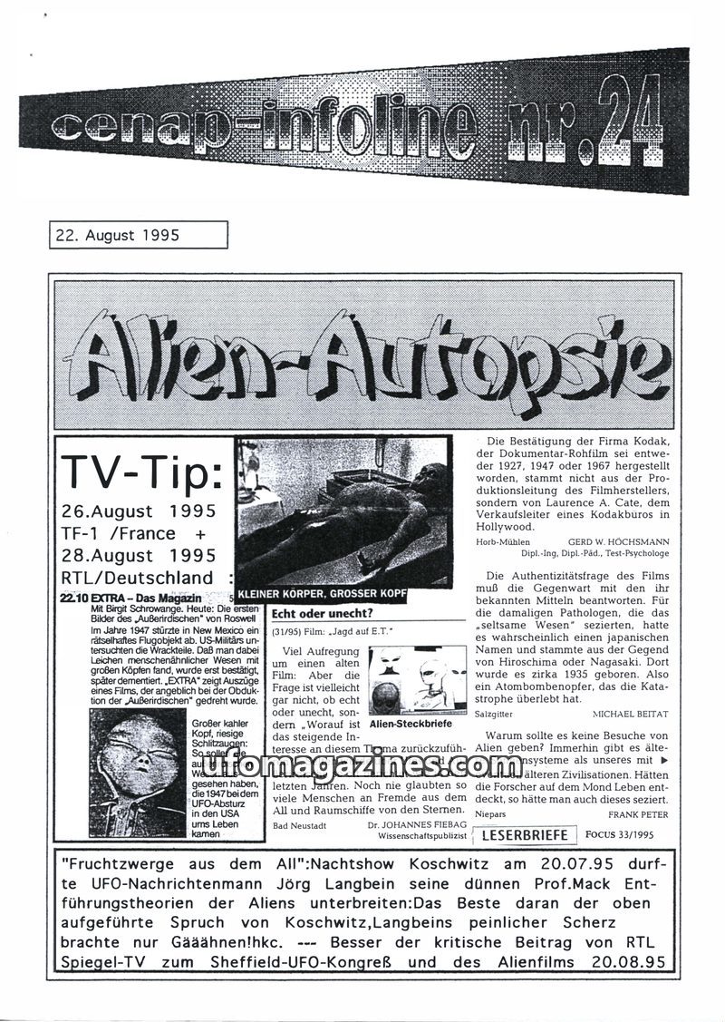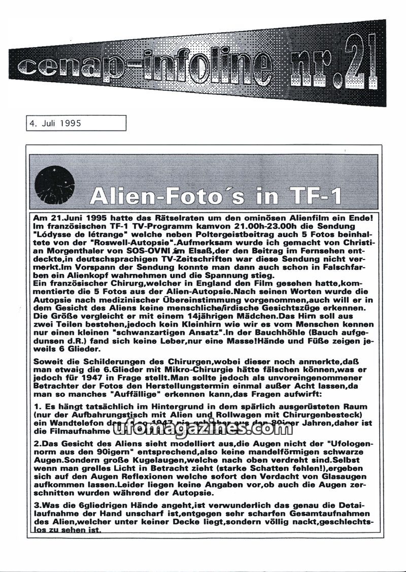 This issue of cenap-infoline discusses the TF-1 TV program 'Lódysse de létrange' which featured photos from an alleged alien autopsy, purportedly from Roswell. The article scrutini