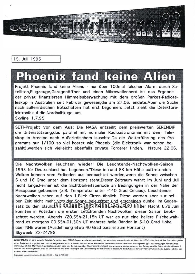 The July 15, 1995 issue of cenap-infoline reports on the conclusion of the privately funded 'Phoenix Project' which used the Parkes radio telescope in Australia to search for extra