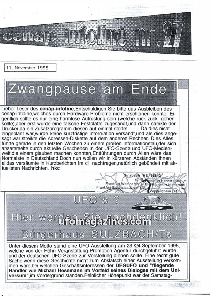 This issue of cenap-infoline addresses technical difficulties that caused a delay in publication. It covers a UFO exhibition held in Sulzbach, Germany, on September 23-24, 1995, wh