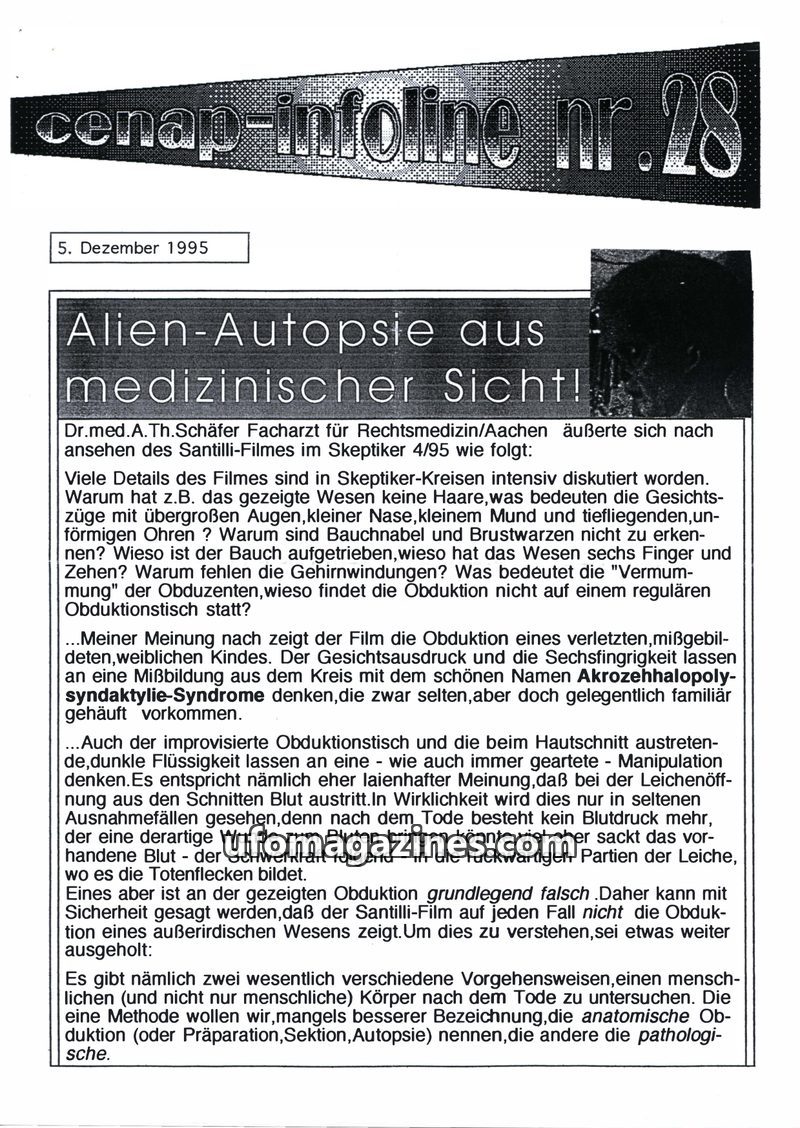 This issue of Cenap Infoline features a medical expert's analysis of the Santilli alien autopsy film, concluding it is not of extraterrestrial origin. It also reports on a medical