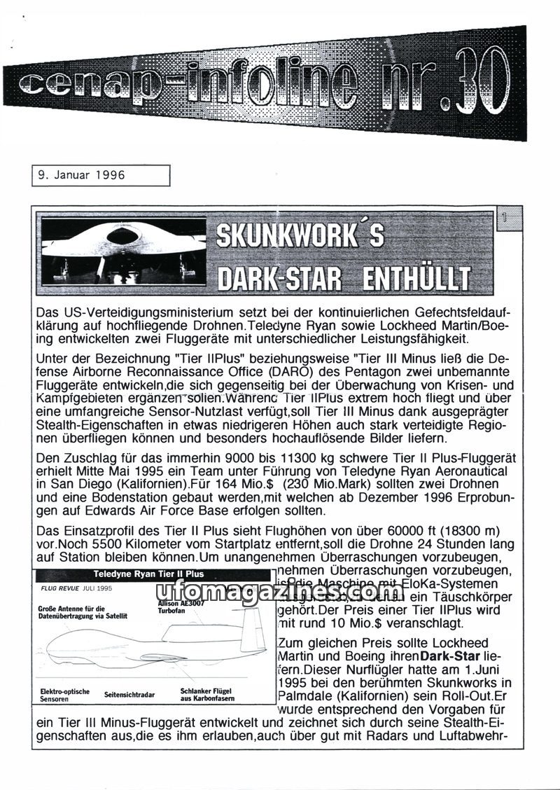 This issue of cenap-infoline details the development of two advanced US reconnaissance drones: the high-altitude Tier II Plus by Teledyne Ryan and the stealthy Tier III Minus, code