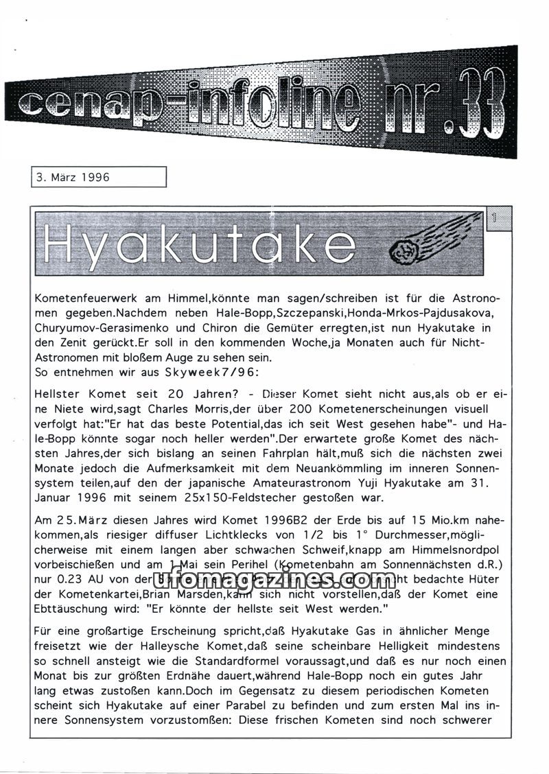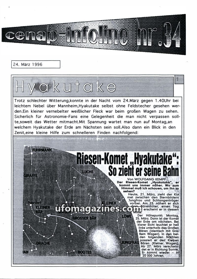 This issue of cenap-infoline (nr. 34, March 24, 1996) covers Comet Hyakutake, noting its visibility and trajectory. It also delves into UFO phenomena, including a reinterpretation