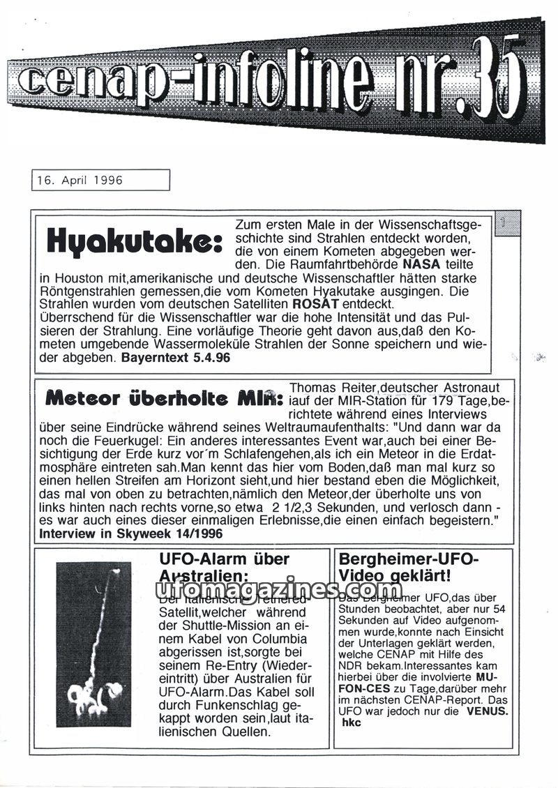This issue of cenap-infoline reports on the discovery of X-ray radiation from Comet Hyakutake, detected by the German satellite ROSAT. Astronaut Thomas Reiter shares his experience