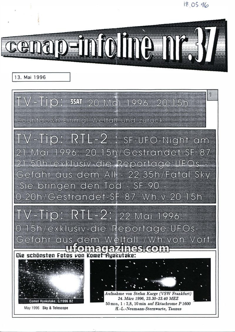 This issue of cenap-infoline (nr. 37, dated May 13, 1996) focuses on astronomical events and UFO reports. It highlights TV programming related to UFOs and comets, including a 'SF-U