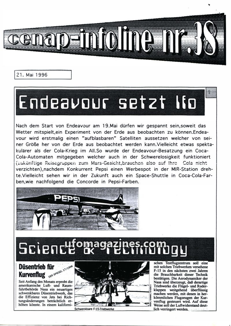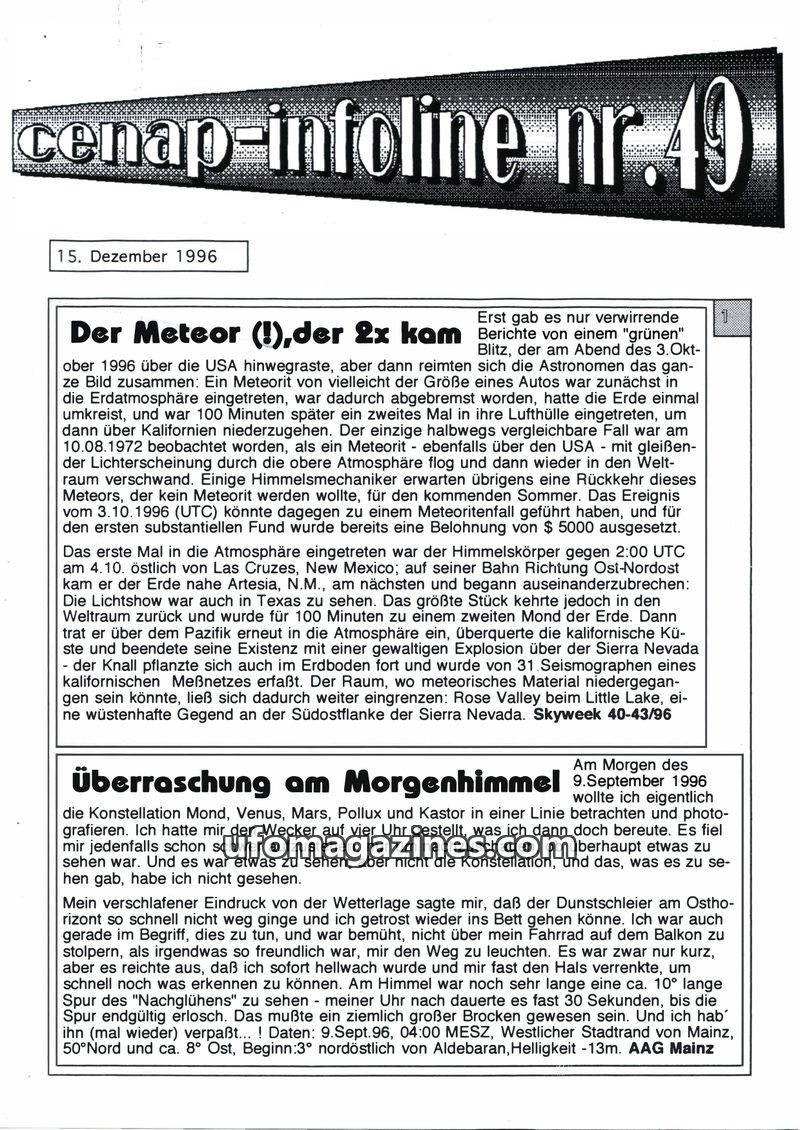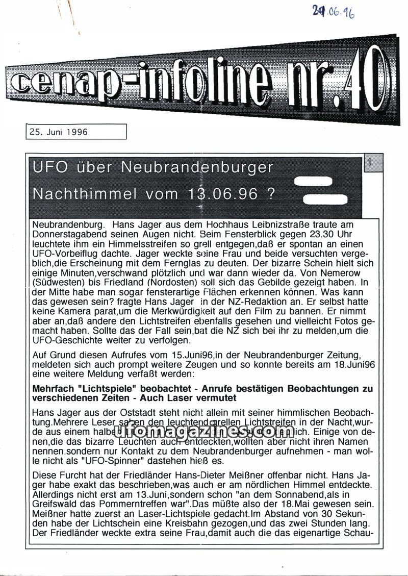This issue of cenap-infoline reports on a UFO sighting over Neubrandenburg on June 13, 1996, observed by Hans Jager and others. While initial reports suggested a UFO, further inves