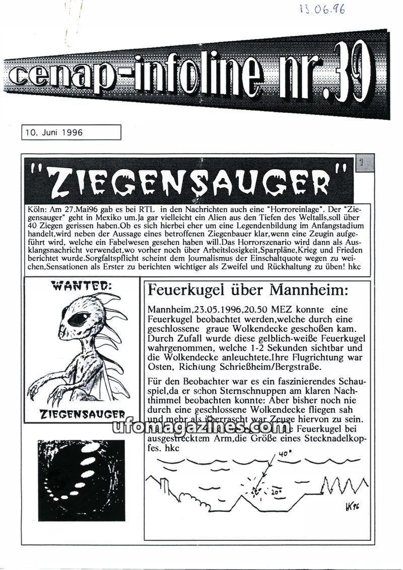 This issue of cenap-infoline (nr. 30, June 10, 1996) reports on sensational news, including a 'Ziegensauger' phenomenon in Mexico allegedly involving an alien. It also details a fi