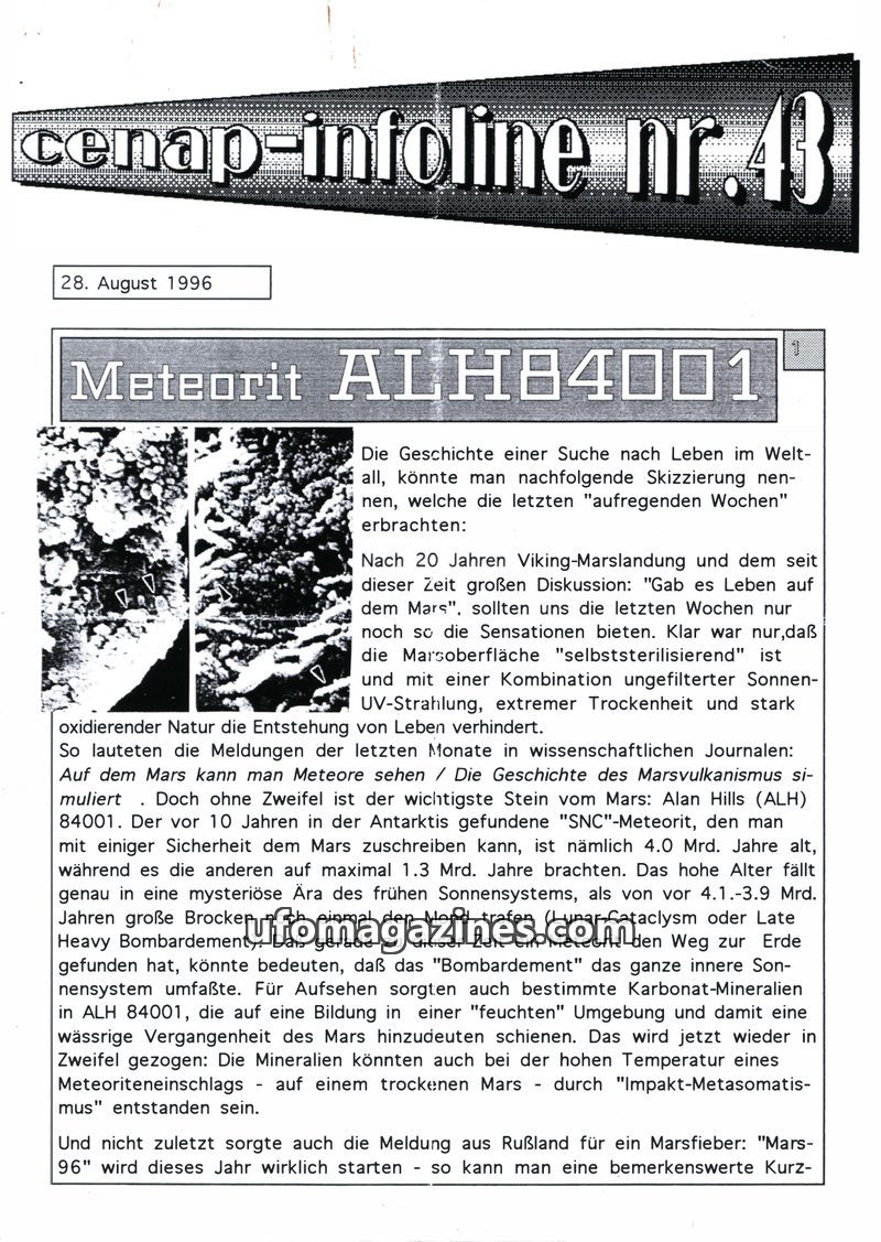 This issue of cenap-infoline covers several topics including the ALH 84001 meteorite and the debate about potential life on Mars, fueled by its high carbon-13 content. It also disc