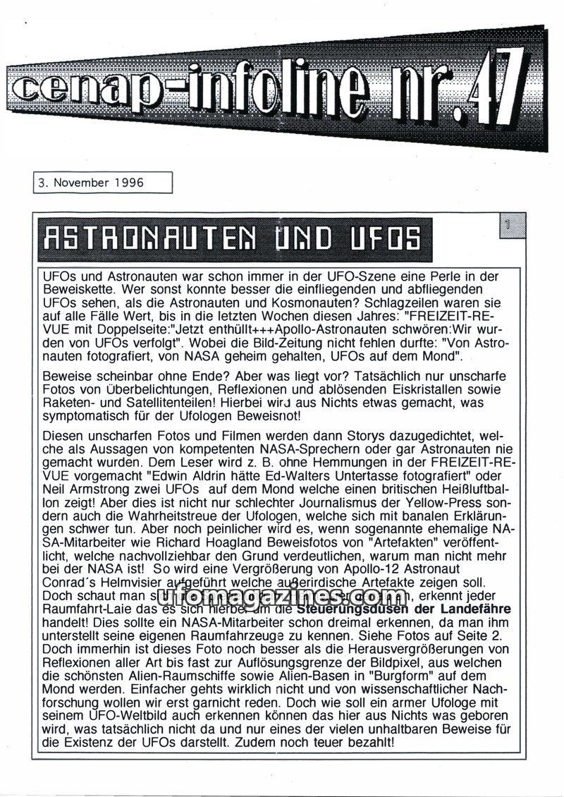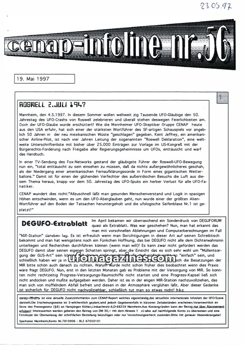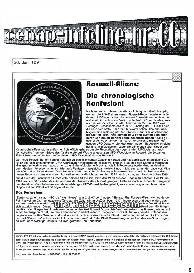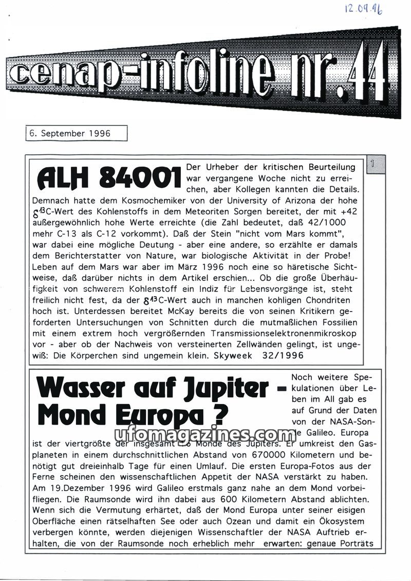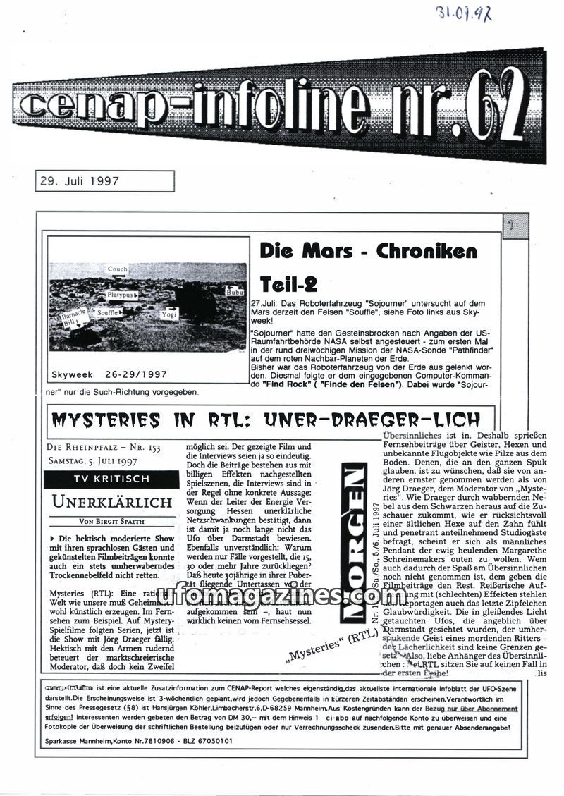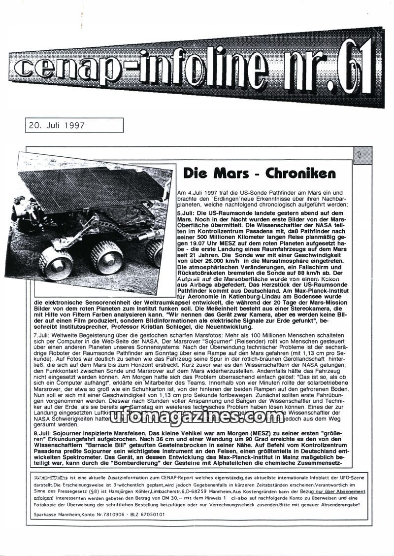 This issue of cenap-infoline covers various topics including the Mars exploration by the Sojourner rover, UFO sightings in Germany (such as near Kaiserslautern and Frankenthal) whi