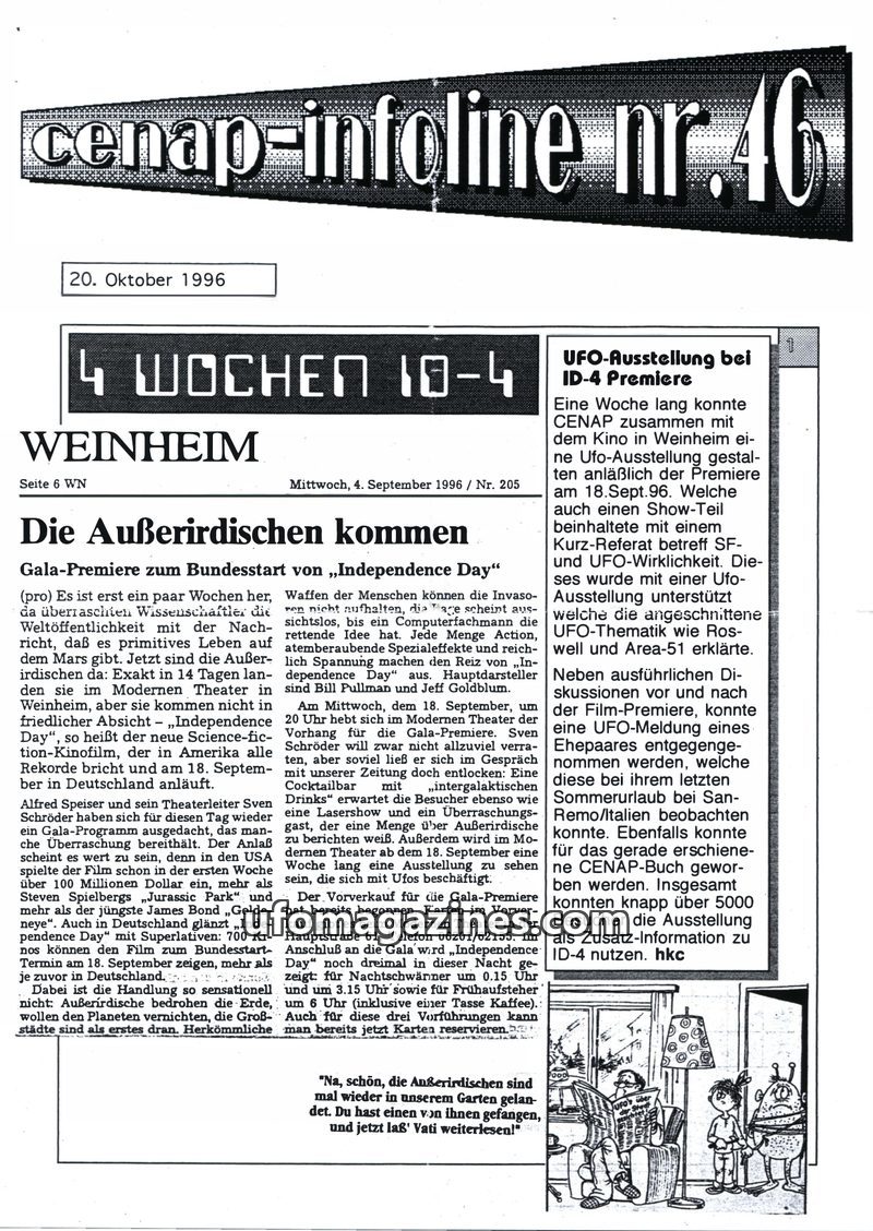 This issue of cenap-infoline focuses on the premiere of the science fiction film 'Independence Day' in Weinheim, Germany, highlighting a special gala event at the Modernes Theater