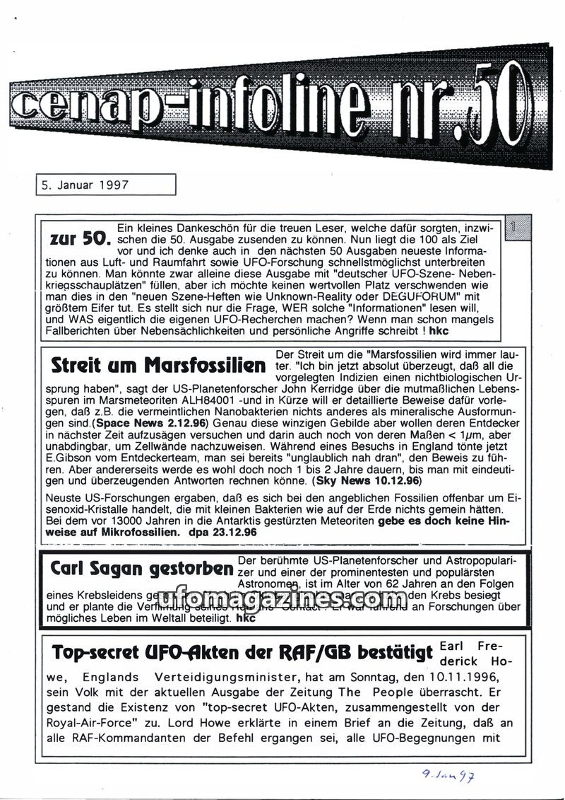 This issue of cemap-infoline (nr.50, Jan 1997) discusses the ongoing debate about alleged Mars fossils, the death of astronomer Carl Sagan, and the UK government's confirmation of