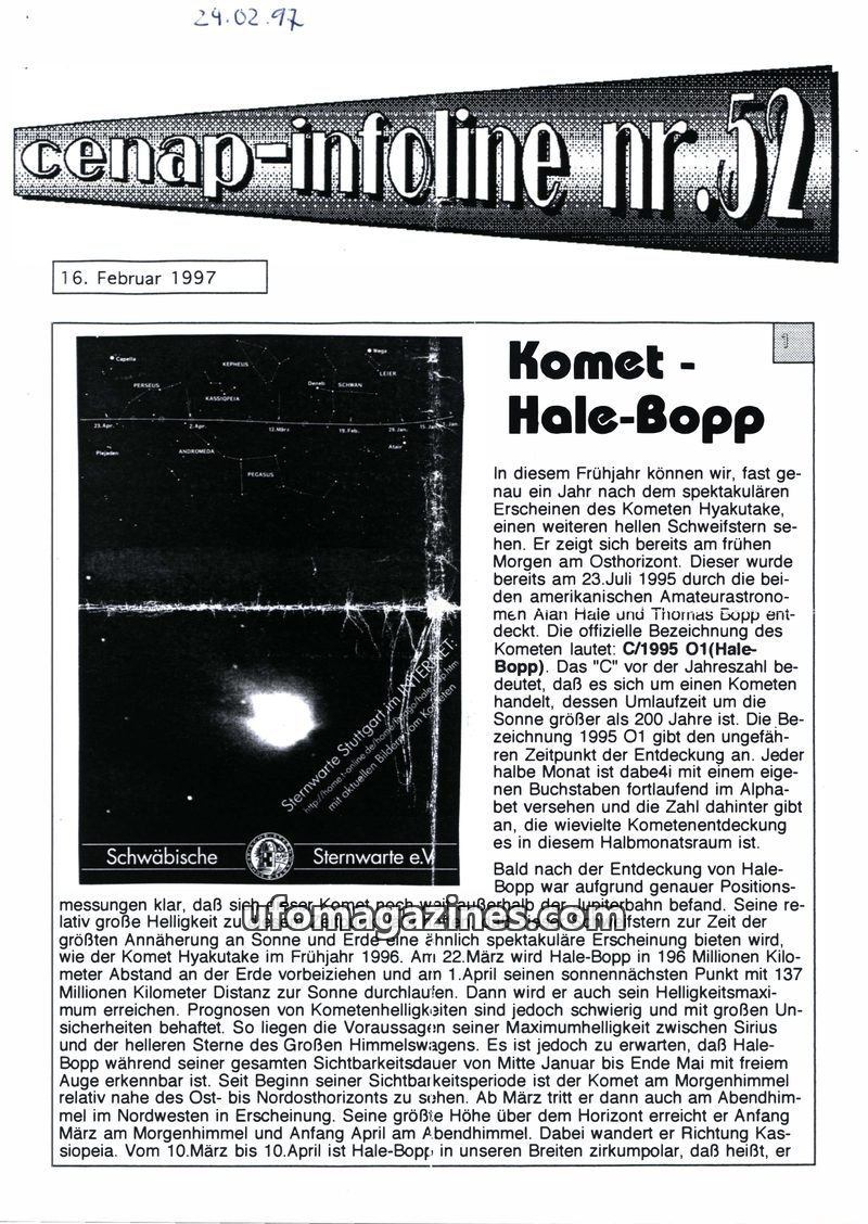 This issue of cenap-infoline from February 1997 features Comet Hale-Bopp, detailing its discovery and visibility. It also covers astronaut Reinhold Ewald's mission to the space sta