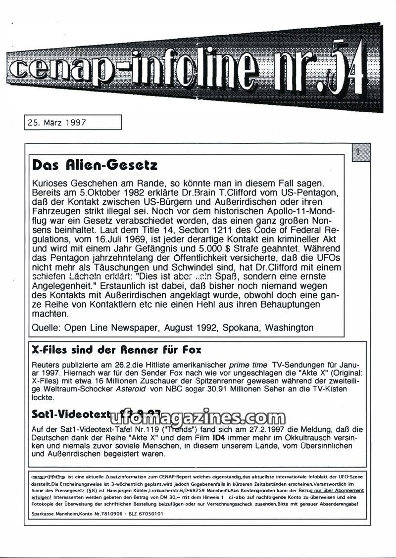 This issue of CENAP Infoline from March 1997 covers several UFO-related topics. It details a supposed 'Alien Law' from the US Pentagon making contact with extraterrestrials illegal