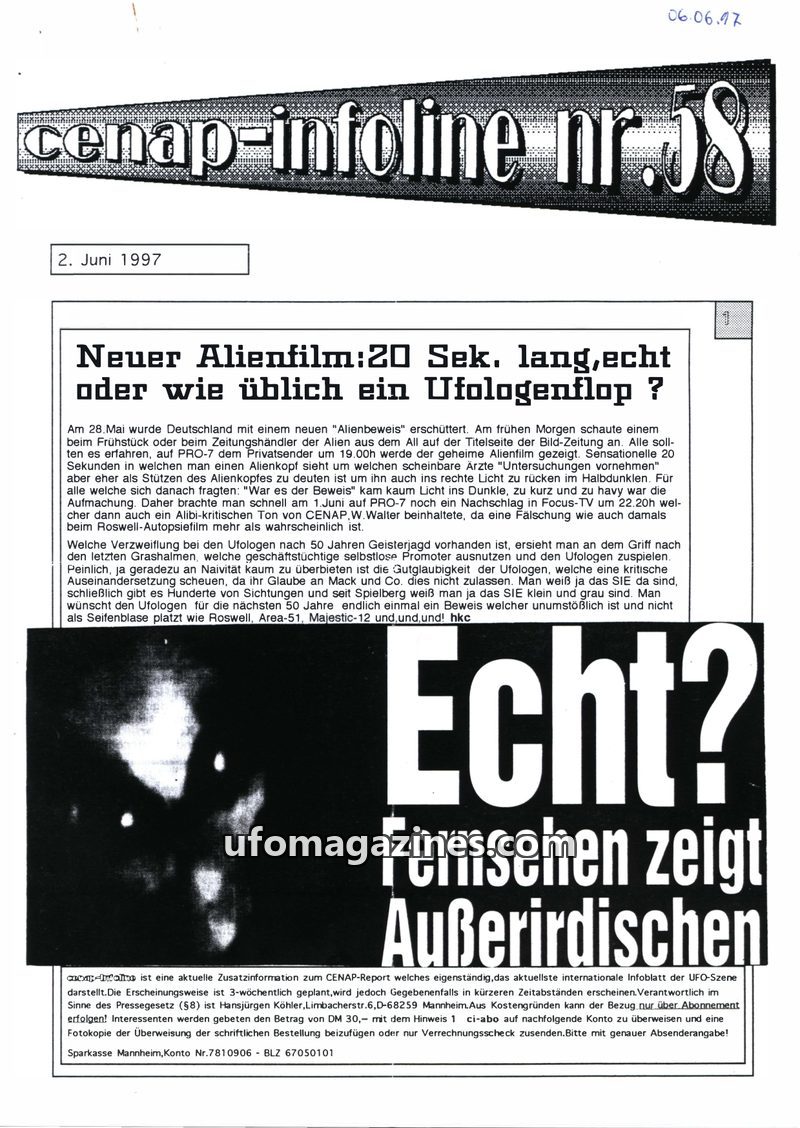This issue of CENAP-Infoline critically examines a new alien film broadcast on German television, questioning its authenticity and labeling it a potential 'Ufologenflop'. It also t