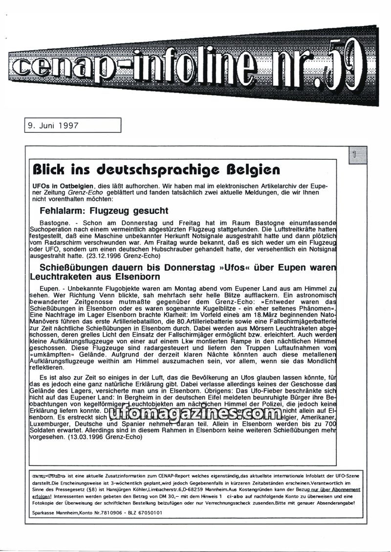 This issue of cenap-infoline focuses on UFO reports from German-speaking Belgium, including sightings near Eupen and Bastogne. It clarifies that many observed phenomena, such as br