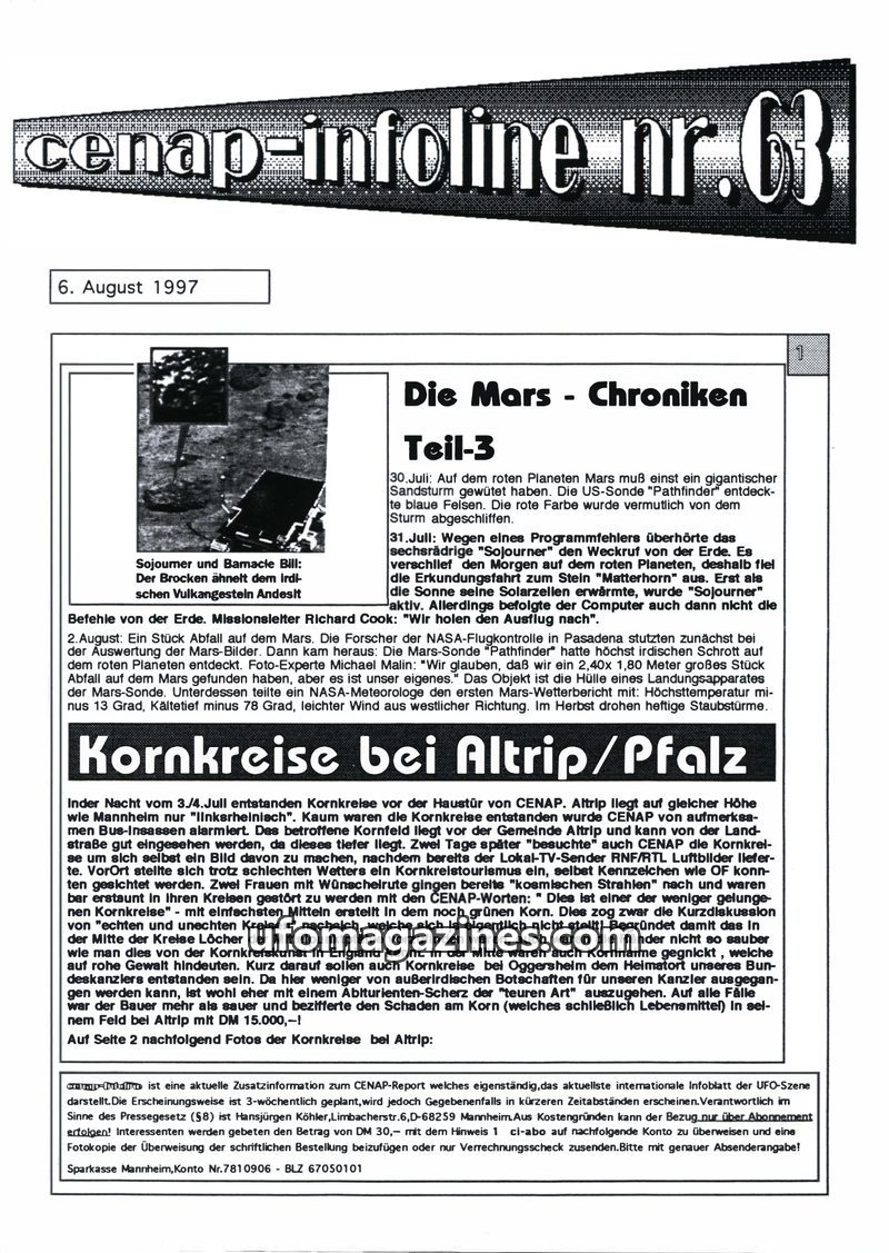 This issue of CENAP-Infoline covers several topics including crop circles in Altrip, Germany, with significant crop damage reported. Mars exploration updates detail the 'Sojourner'