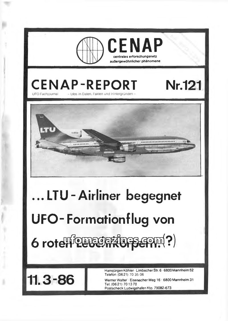 This issue of CENAP-REPORT Nr.121 details an LTU airliner's encounter with a formation of six red glowing UFOs. It also investigates the alleged recovery of a UFO at Wright-Patters