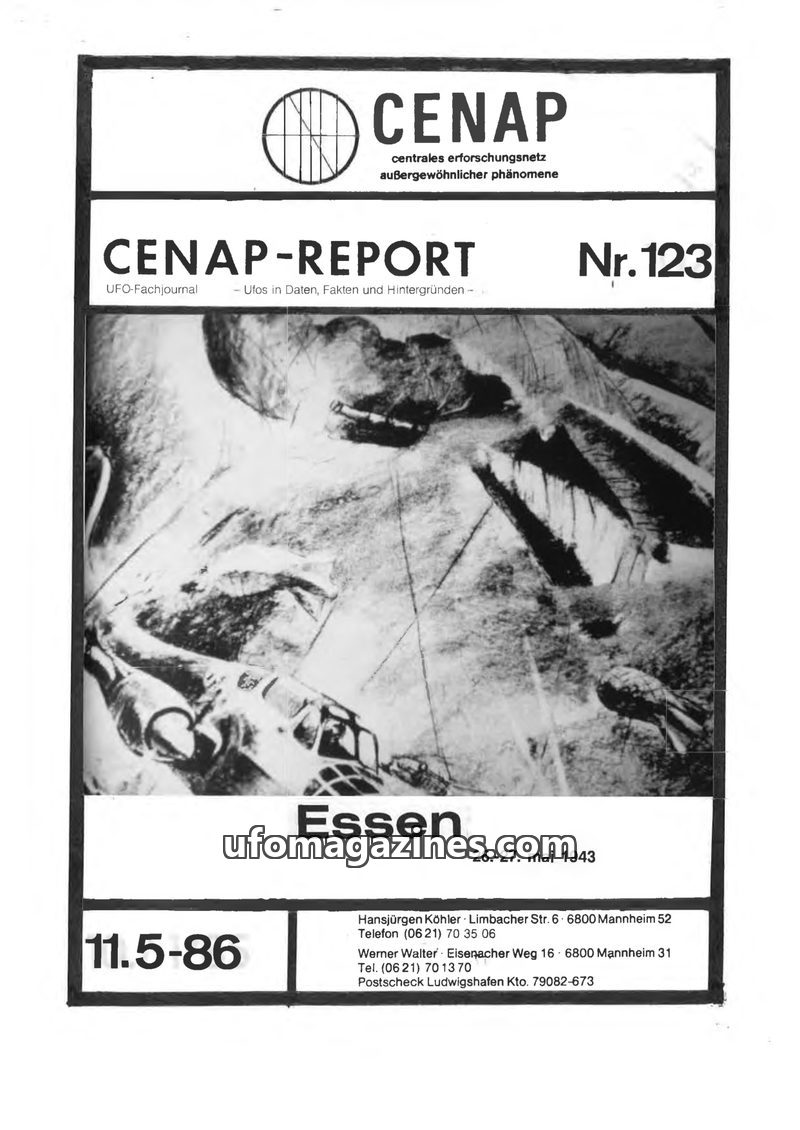 This issue of CENAP-REPORT (Nr. 123) investigates a UFO sighting reported by G.N. Cockfort, a RAF member, during a bombing raid on Essen on May 26-27, 1943. Cockfort described a la