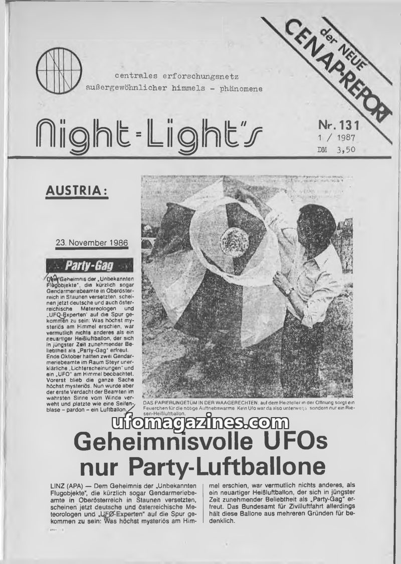 This issue of Night-Light's investigates the 'mystery lights' reported in Austria, suggesting they were likely novel hot air balloons used as party favors, though potentially conce