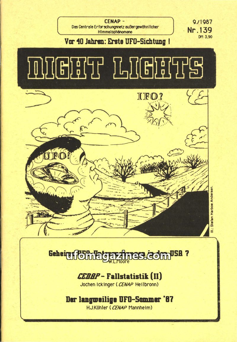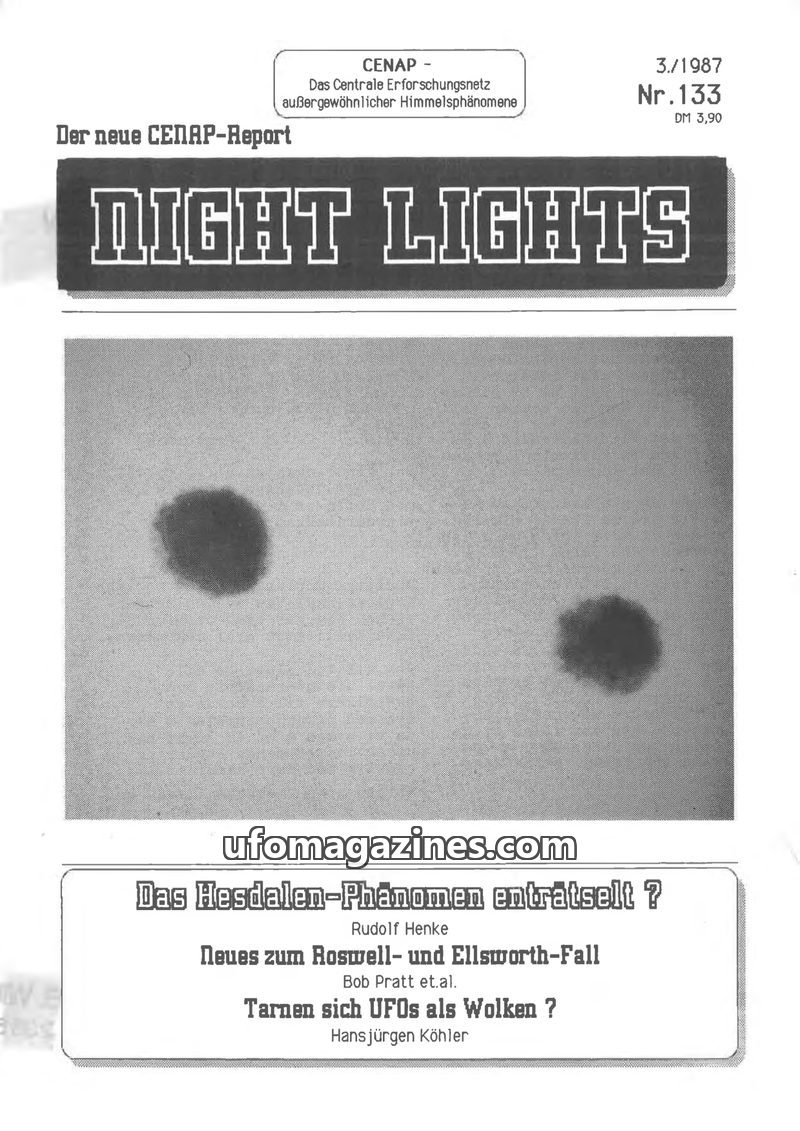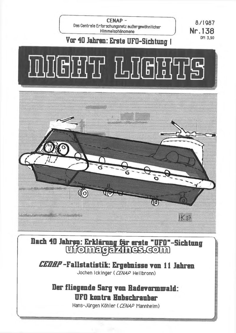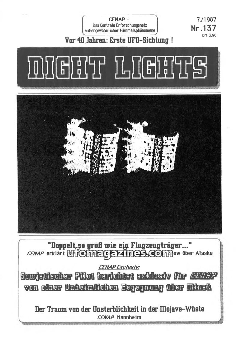This issue of 'Night Lights' from CENAP (Central Research Network for Extraordinary Sky Phenomena) focuses on UFO sightings and related investigations. Articles discuss an alleged