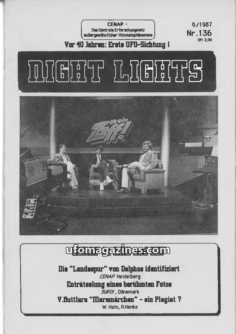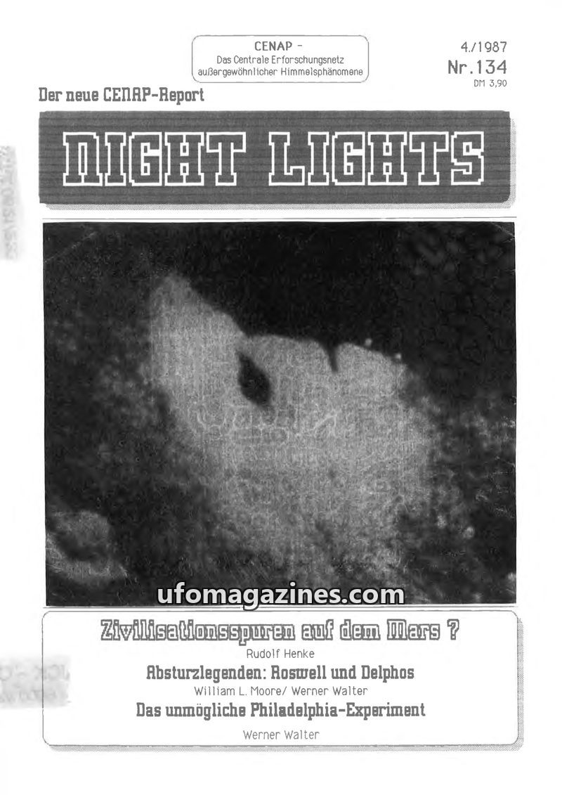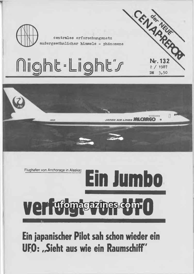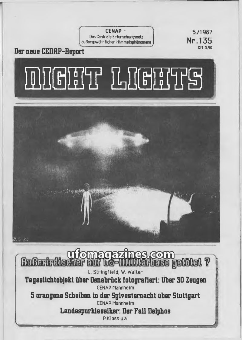 This issue of 'Night Lights' from CENAP (Central Research Network for Extraordinary Sky Phenomena) focuses on UFO sightings and related investigations. Articles discuss an alleged