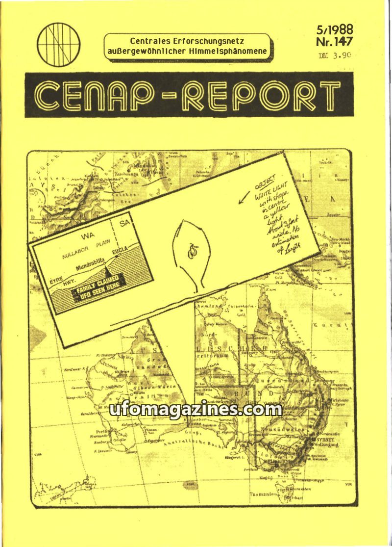 This issue of CENAP-REPORT focuses on UFO phenomena, particularly historical sightings from the 1930s and a recent incident in Australia. The magazine details various 'ghost flyer'