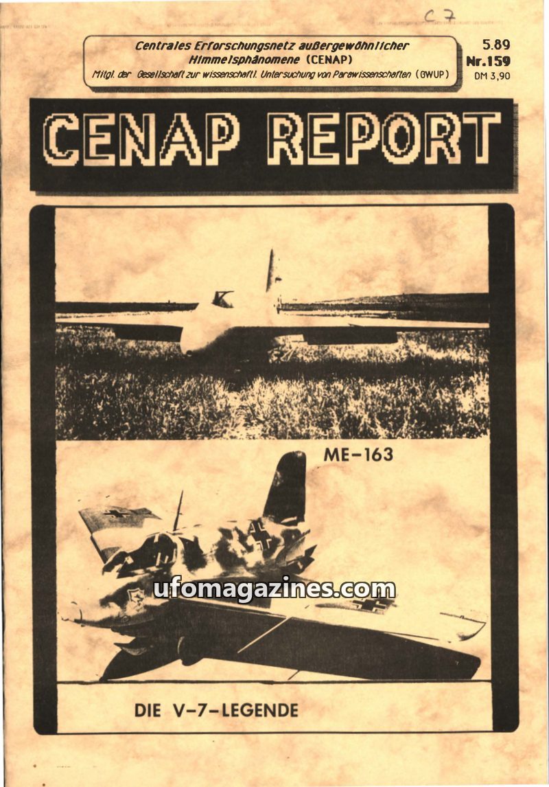 This issue of CENAP REPORT focuses on the 'V-7 Legend,' exploring the possibility of German flying saucer designs from WWII. It details the development of advanced aircraft like th