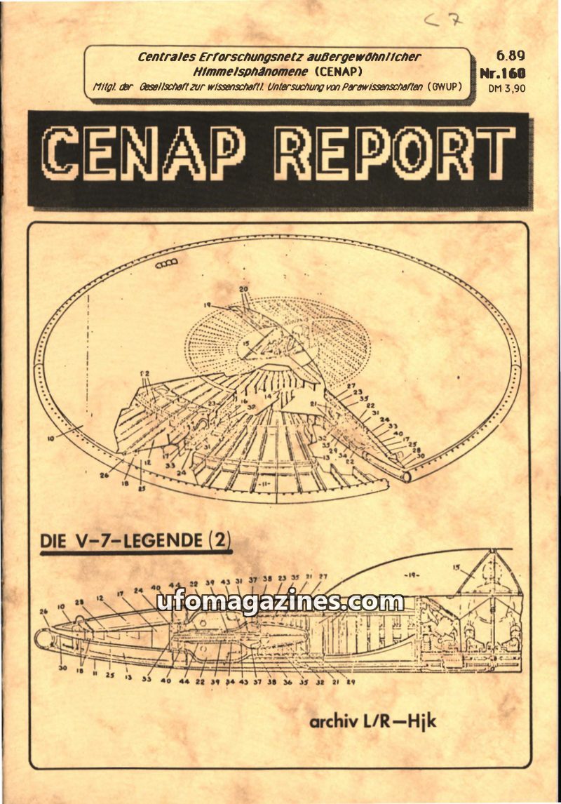 This issue of CENAP REPORT delves into the 'V-7 Legend' and other alleged German flying saucer projects from WWII. It critically examines claims surrounding designs by Schriever, M