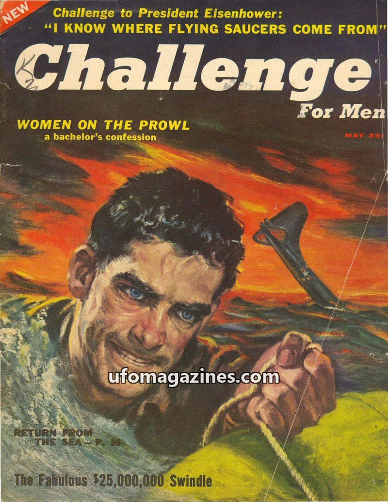 This issue of Challenge magazine from May 1955 presents a bold challenge to President Eisenhower's statement that flying saucers are not from outer space. Airline pilot William Bre