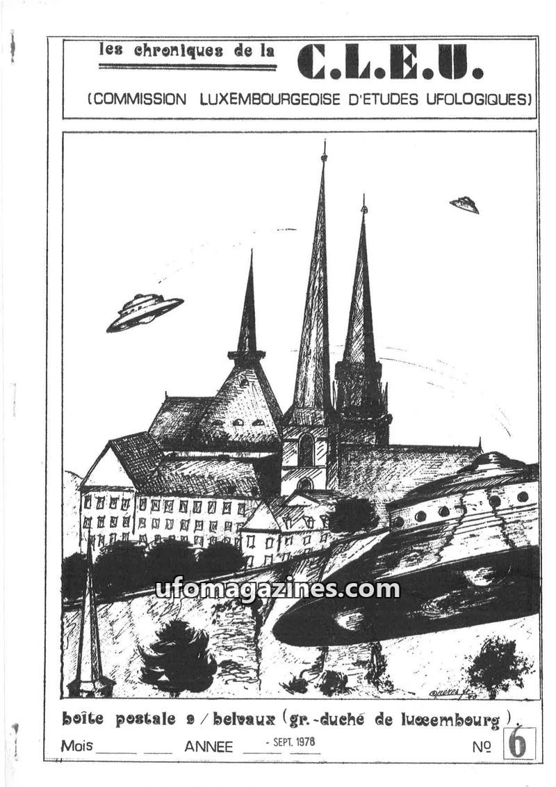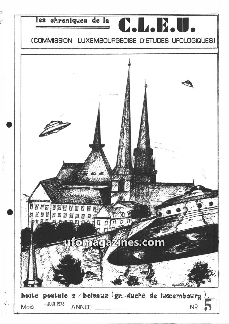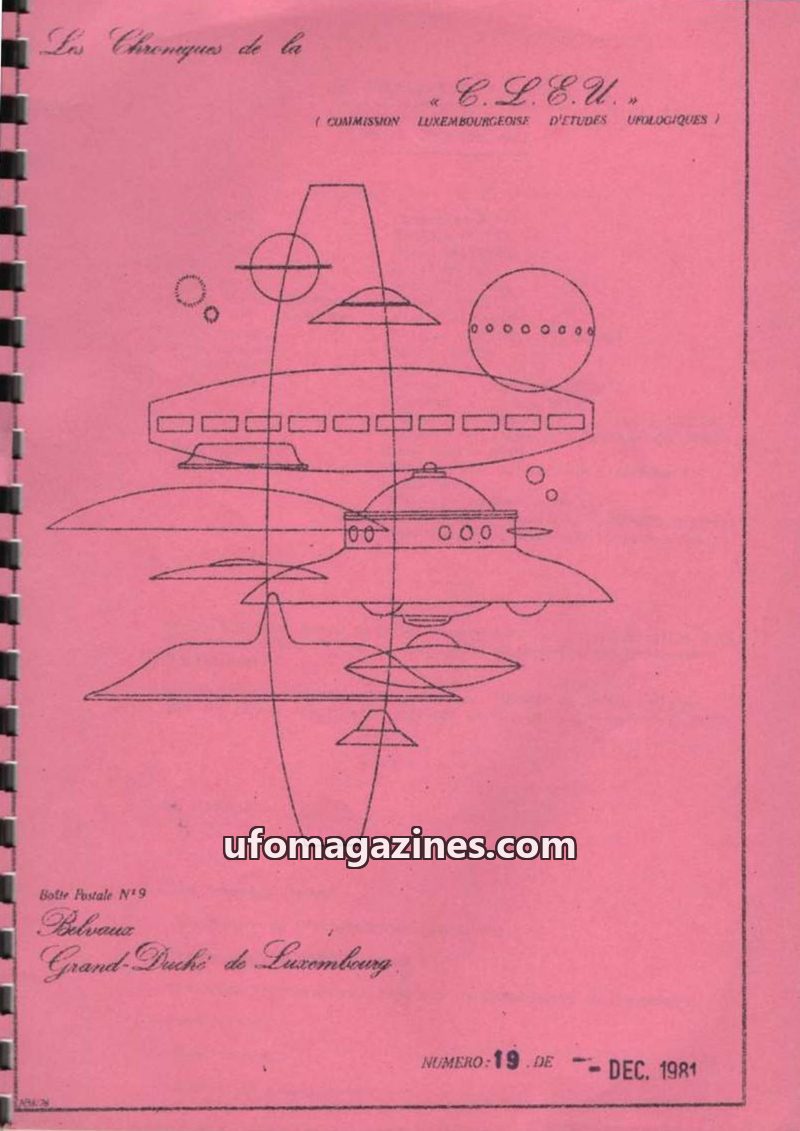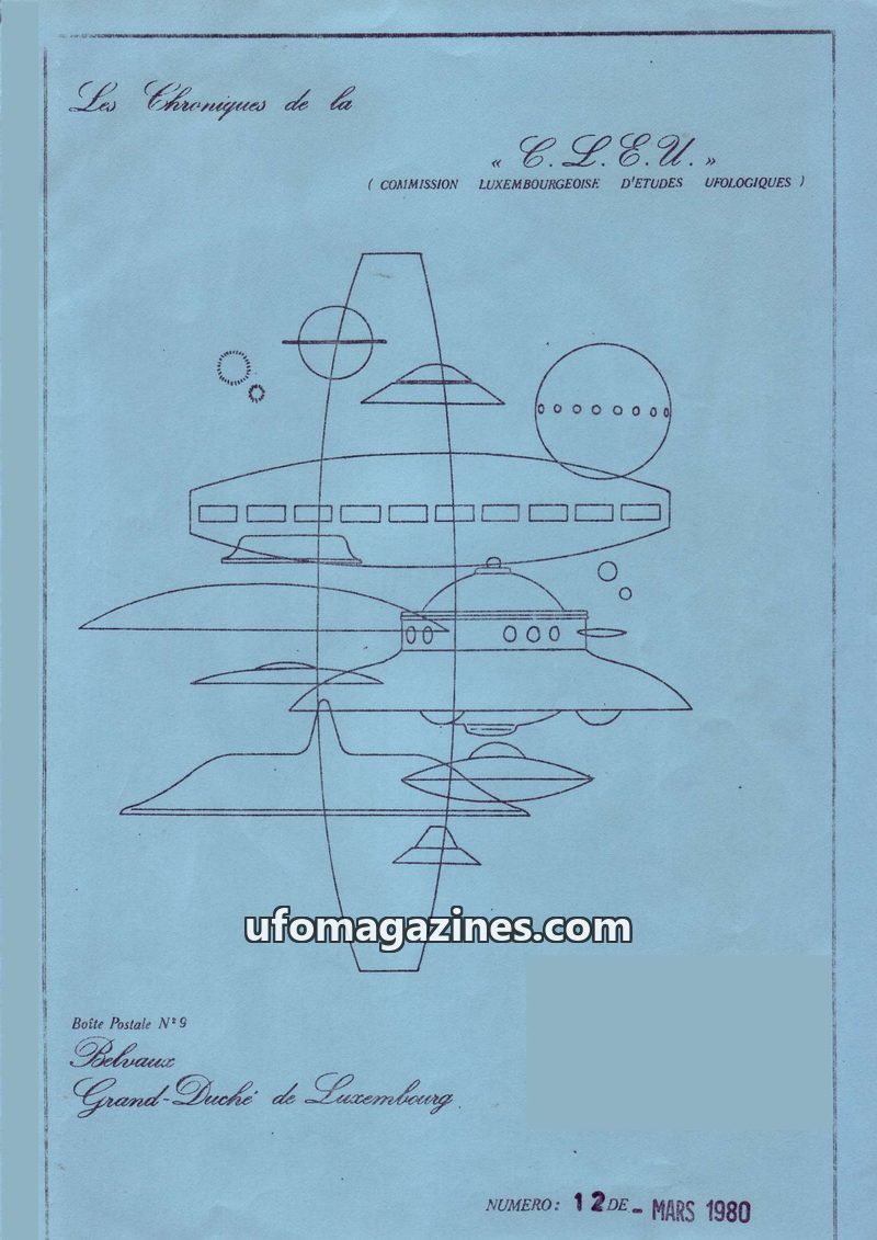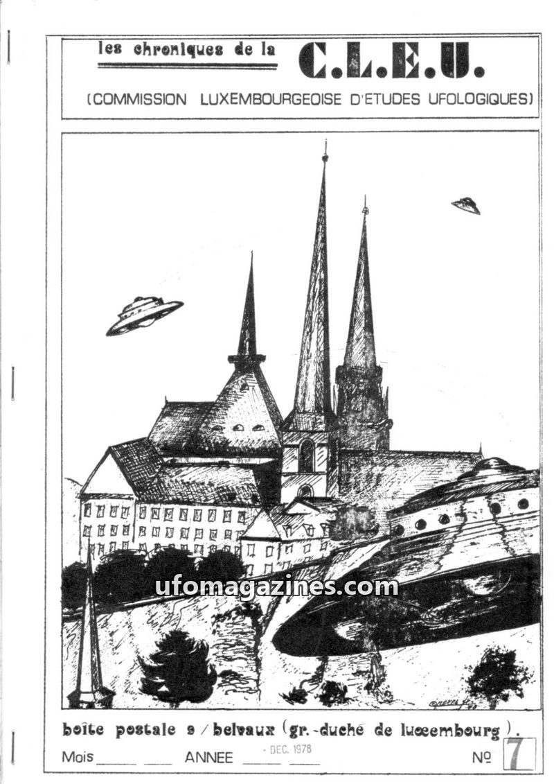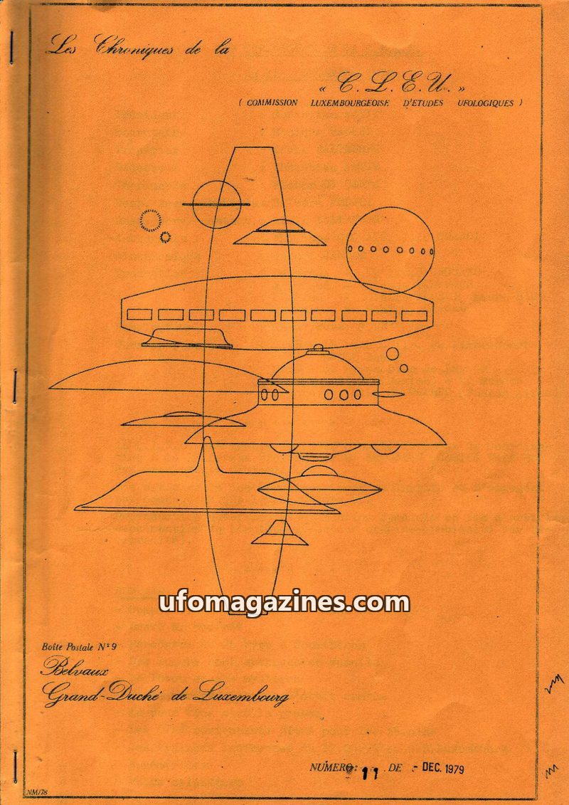 This issue of Les Chroniques de la C.L.E.U. from December 1979 covers UFO activity and investigations in Luxembourg and France. It details the organization's participation in CNEGU
