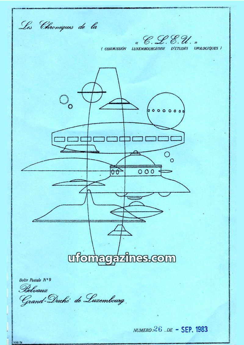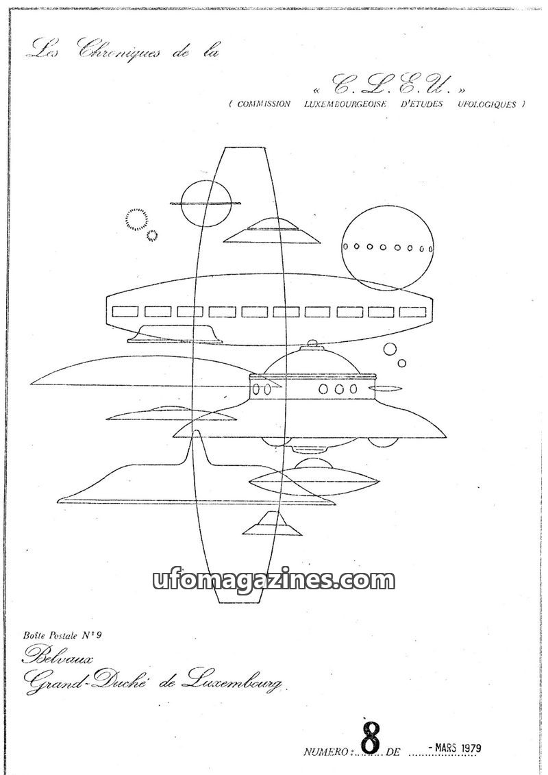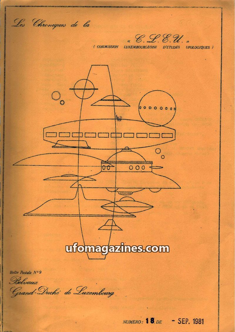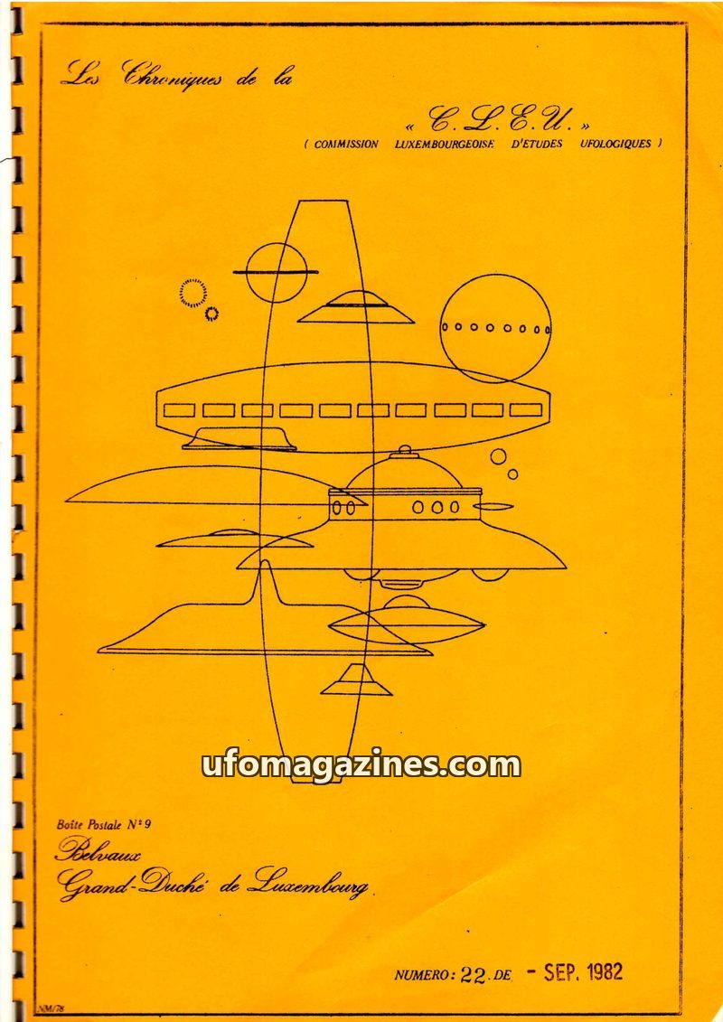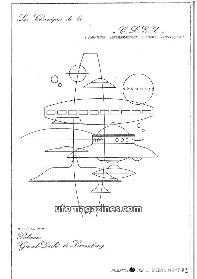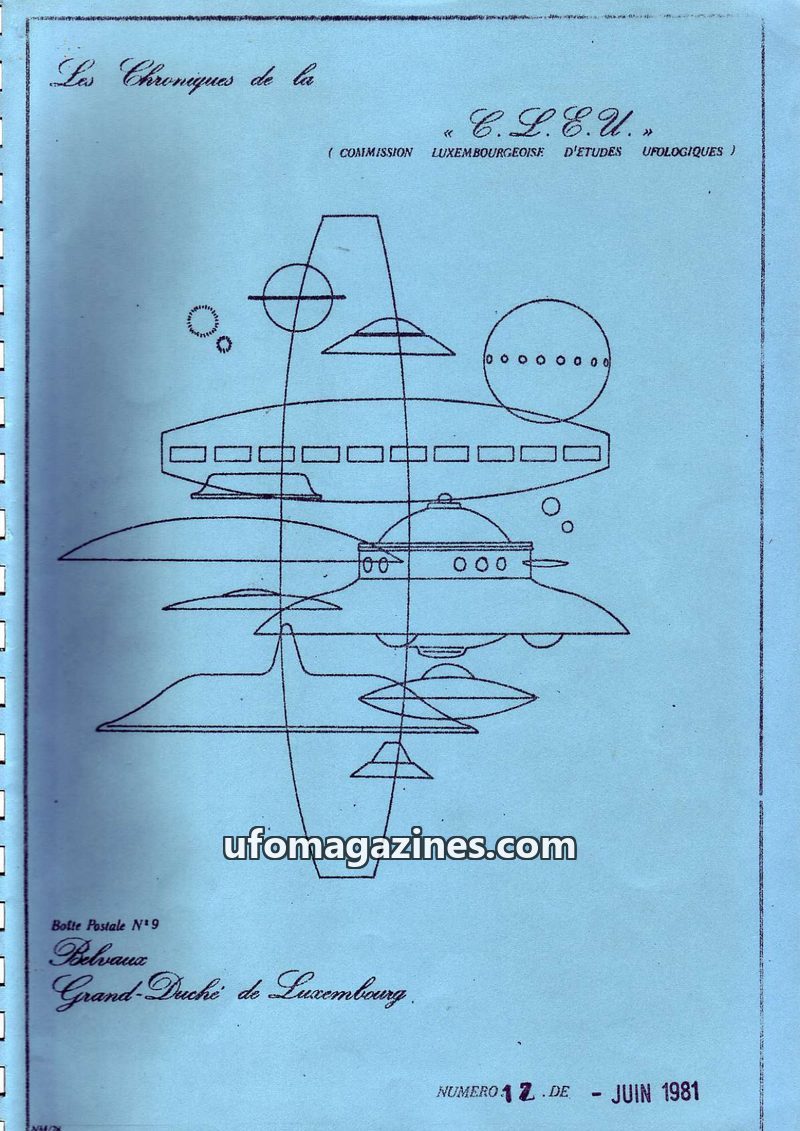 This issue of Les Chroniques de la C.L.E.U. from December 1979 covers UFO activity and investigations in Luxembourg and France. It details the organization's participation in CNEGU