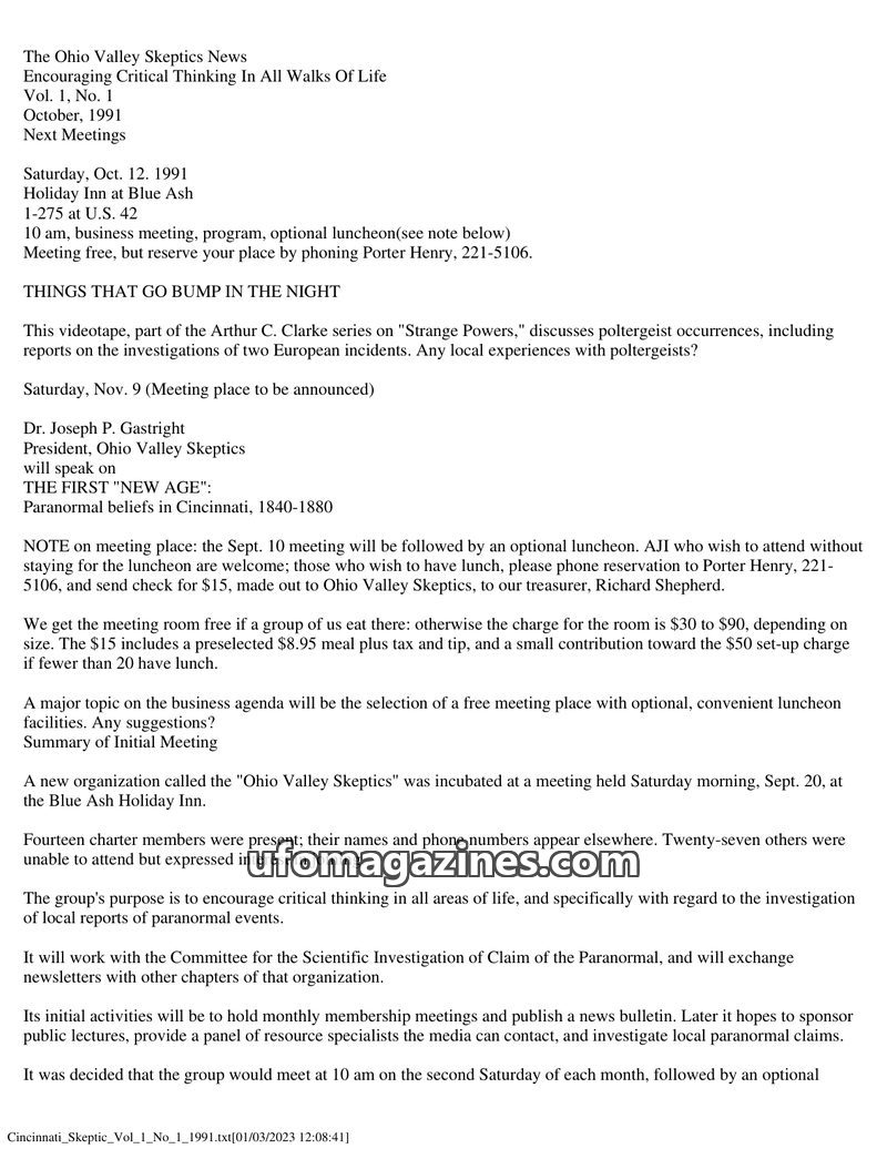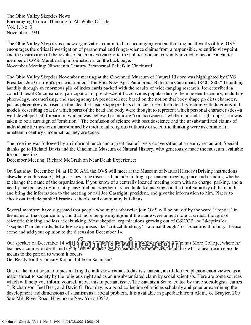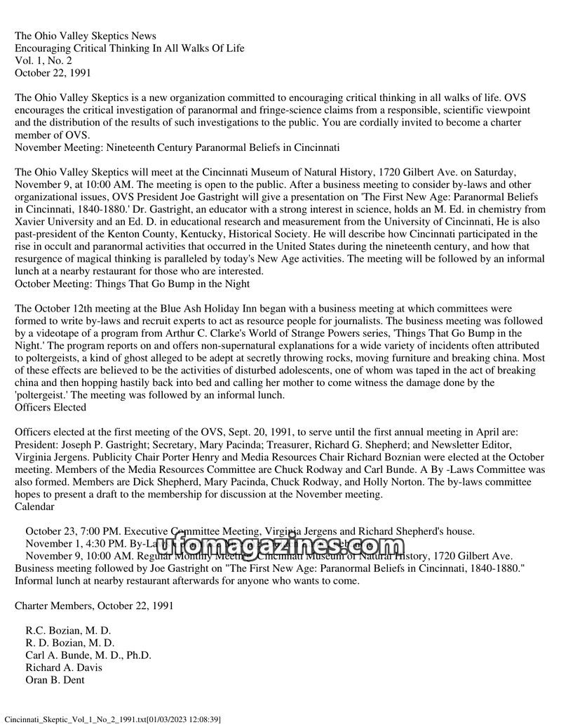 The October 1991 issue of The Ohio Valley Skeptics News announces the formation of the organization, dedicated to encouraging critical thinking and investigating paranormal claims.