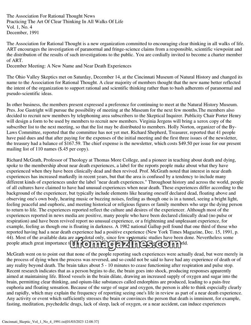 The Association for Rational Thought (formerly Ohio Valley Skeptics) aims to promote clear thinking and scientific investigation of paranormal claims. The December 1991 meeting fea