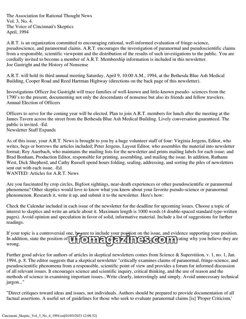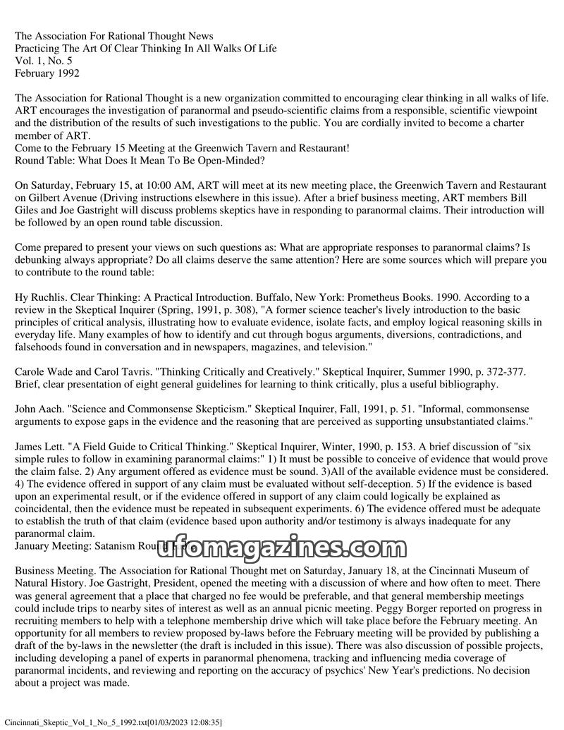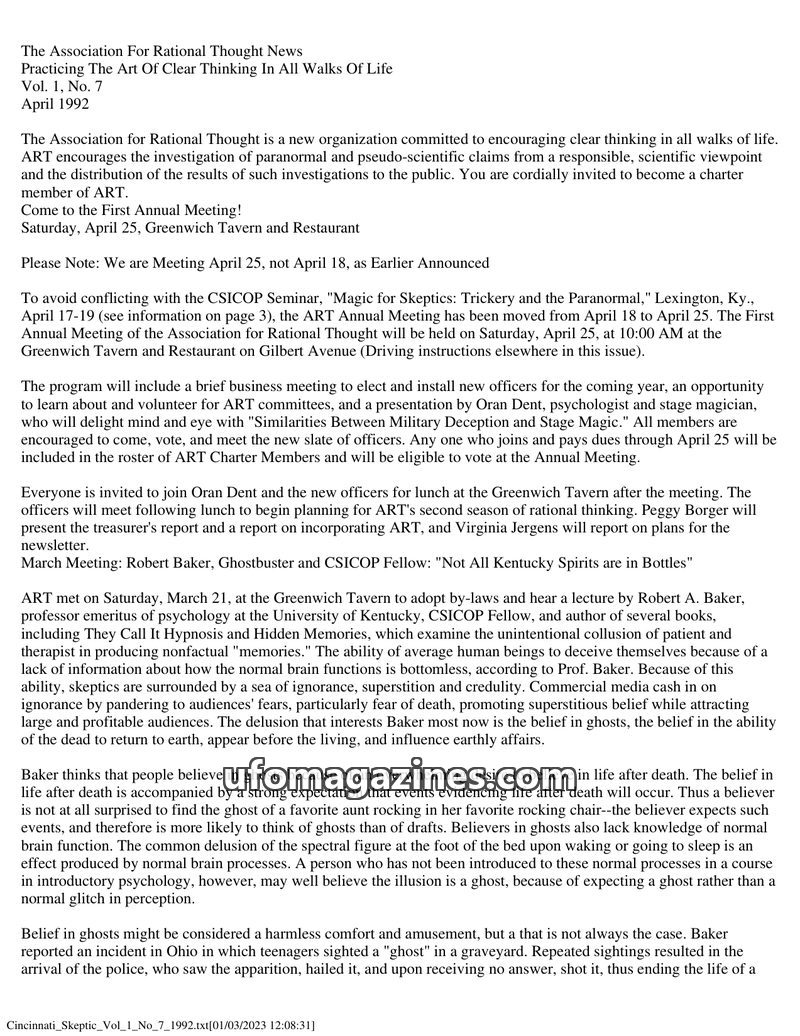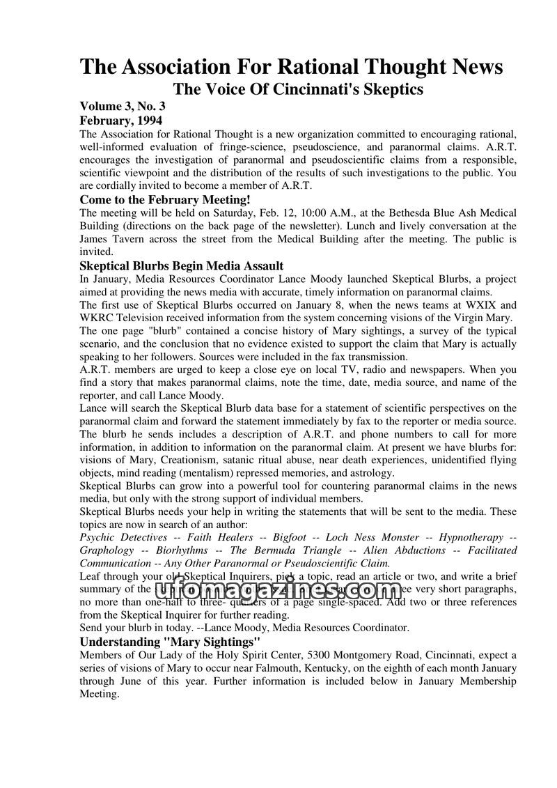 The April 1992 issue of The Association For Rational Thought News introduces ART as an organization promoting clear thinking and scientific investigation of paranormal claims. It a