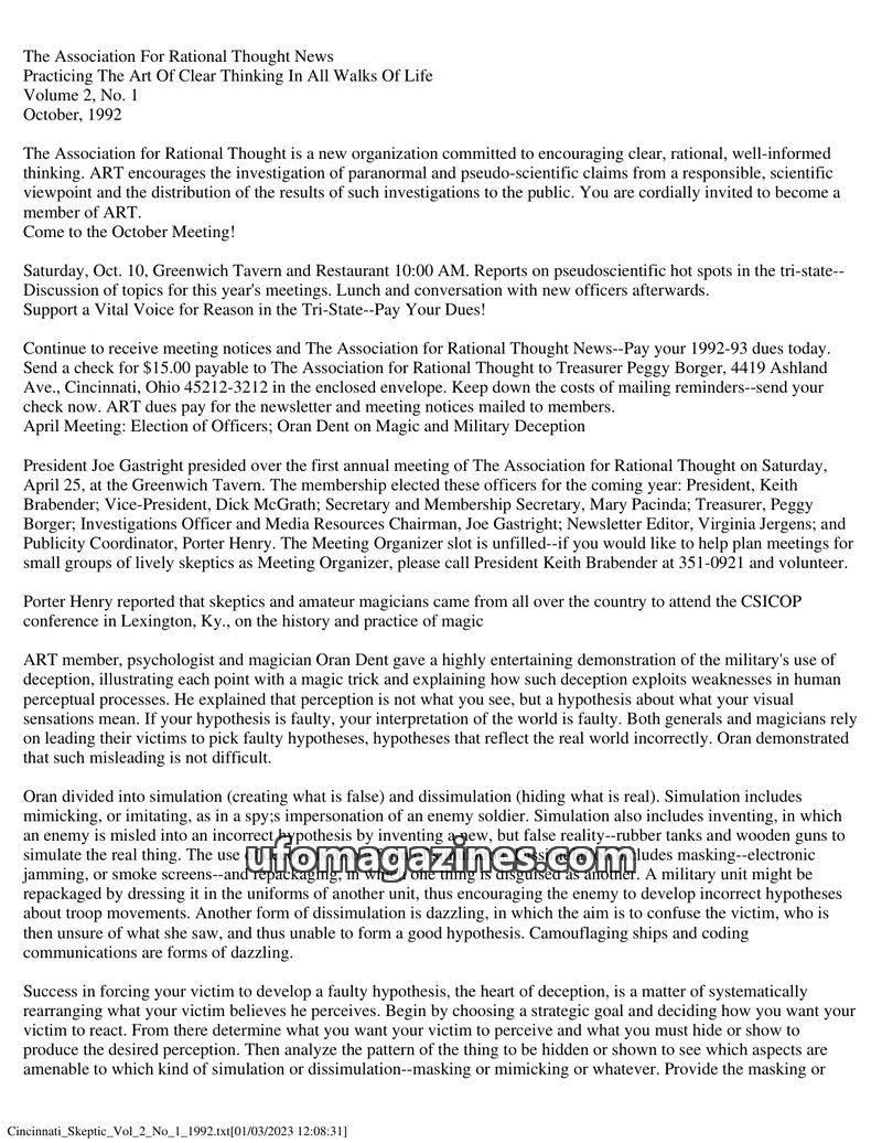 This issue of The Association For Rational Thought News (March 1992) details the organization's mission to promote rational thought and scientific investigation of paranormal claim