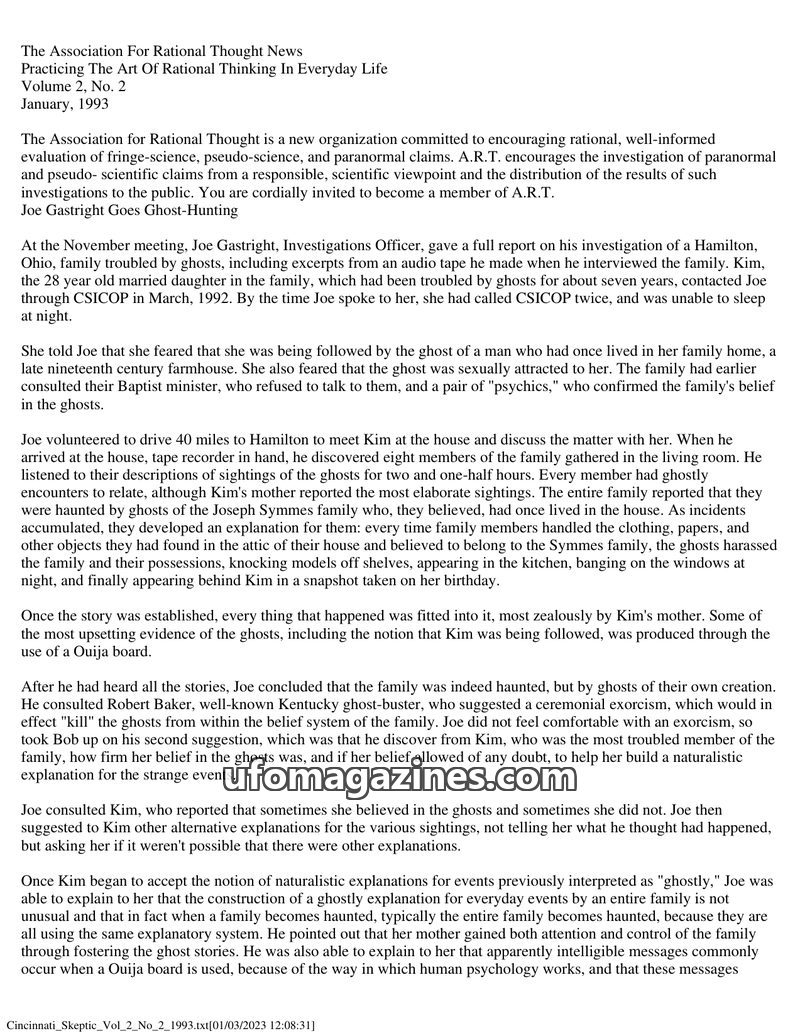 This issue of The Association For Rational Thought News features Joe Gastright's investigation into a family experiencing alleged paranormal activity, which he attributes to psycho