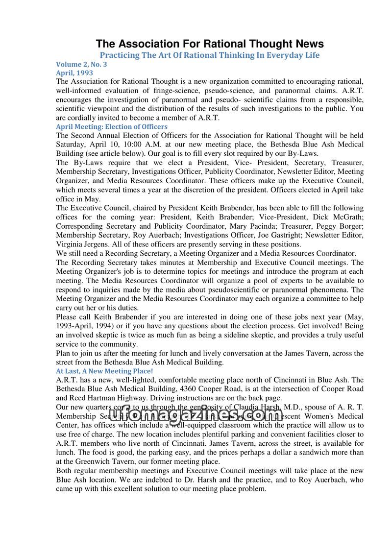 The April 1993 issue of The Association For Rational Thought News details the organization's commitment to rational evaluation of fringe science and paranormal claims. It announces