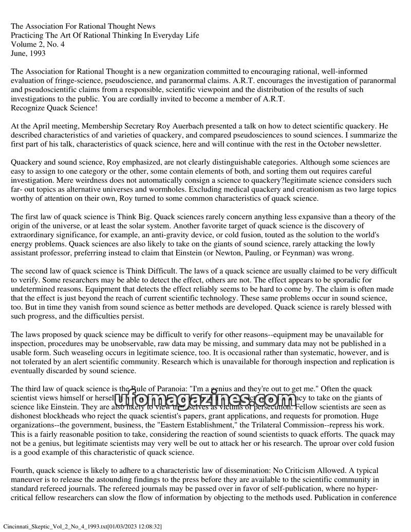 This issue of The Association For Rational Thought News (June 1993) features a talk by Roy Auerbach on identifying 'quack science' by its characteristics: 'Think Big,' 'Think Diffi
