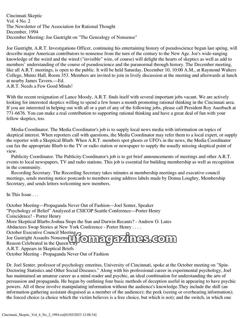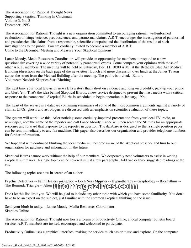 This issue of The Association for Rational Thought News focuses on promoting rational evaluation of paranormal claims. It introduces 'Skeptical Blurbs,' a service to counter media