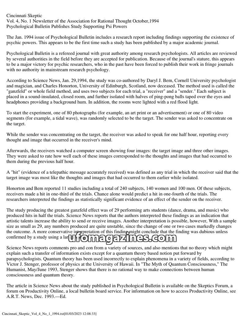This issue of Cincinnati Skeptic features a report on a study published in Psychological Bulletin that supports the existence of psychic powers, using the ganzfeld method. It also