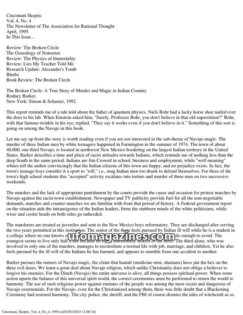 This issue of Cincinnati Skeptic features reviews of several books, including 'The Broken Circle' which details a racially motivated murder in Farmington, New Mexico, and the subse