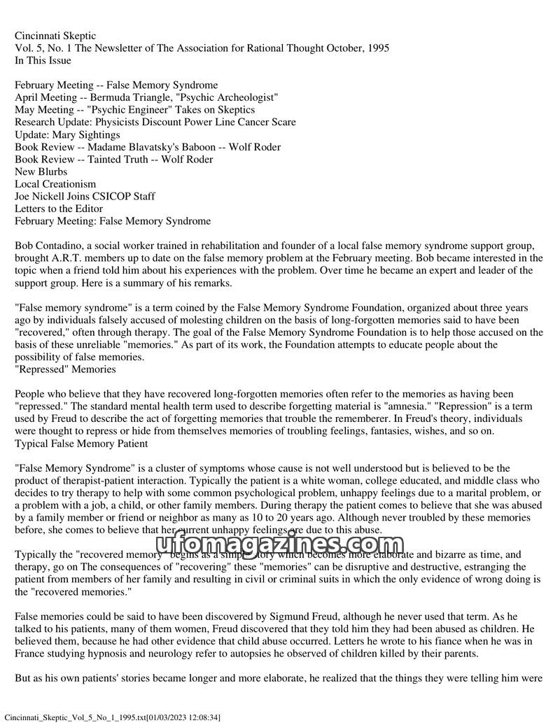 This issue of Cincinnati Skeptic focuses heavily on False Memory Syndrome, with Bob Contadino explaining how it arises from therapist-patient interaction and can lead to false accu