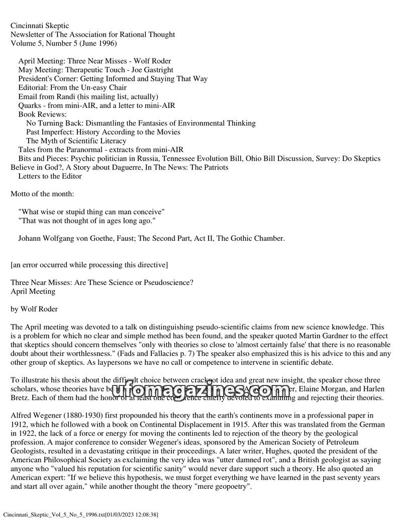 This issue of the Cincinnati Skeptic explores the boundaries between new science and pseudoscience, featuring a talk by Wolf Roder on theories rejected by peers but later vindicate