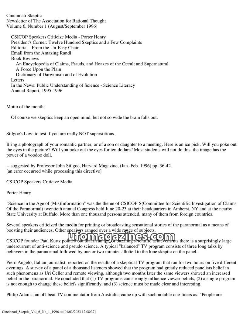 This issue of Cincinnati Skeptic covers the CSICOP's 20th annual Congress, themed 'Science in the Age of (Mis)Information,' where speakers criticized media sensationalism of parano