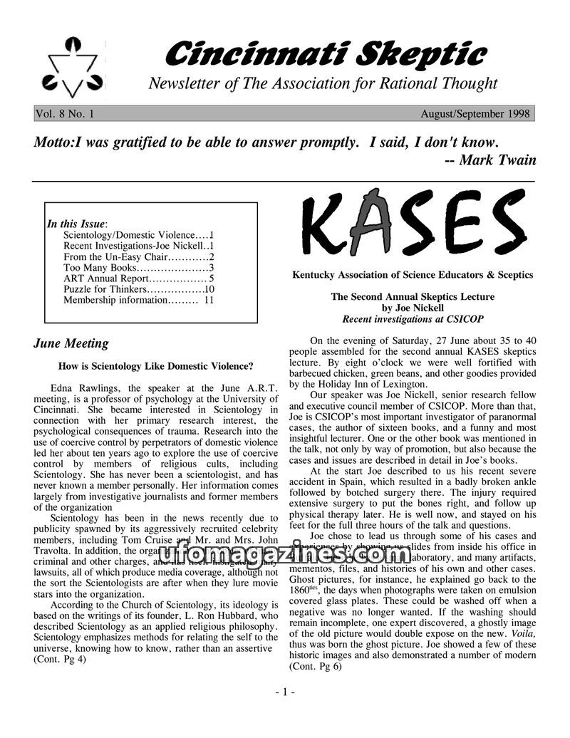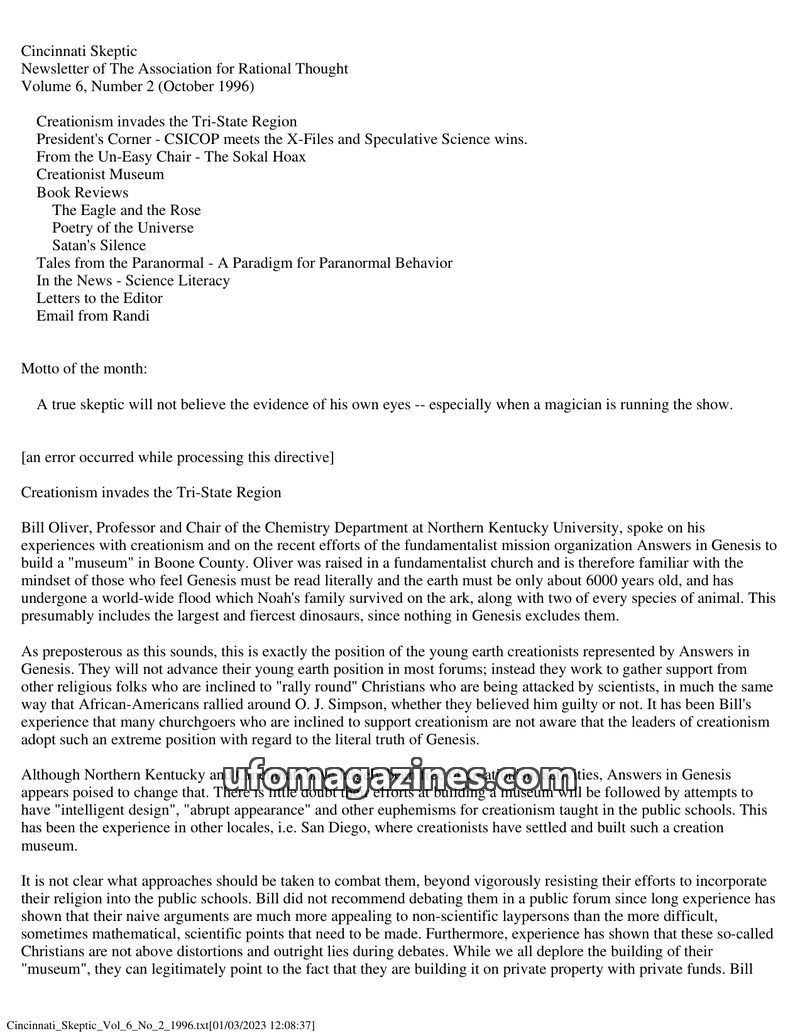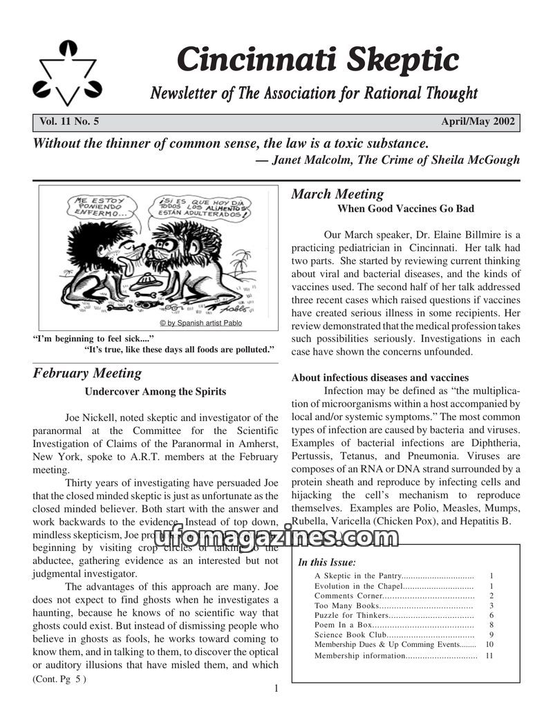 This issue of the Cincinnati Skeptic covers a range of skeptical topics, including a lecture by Joe Nickell on his investigations into paranormal claims and a discussion on the par