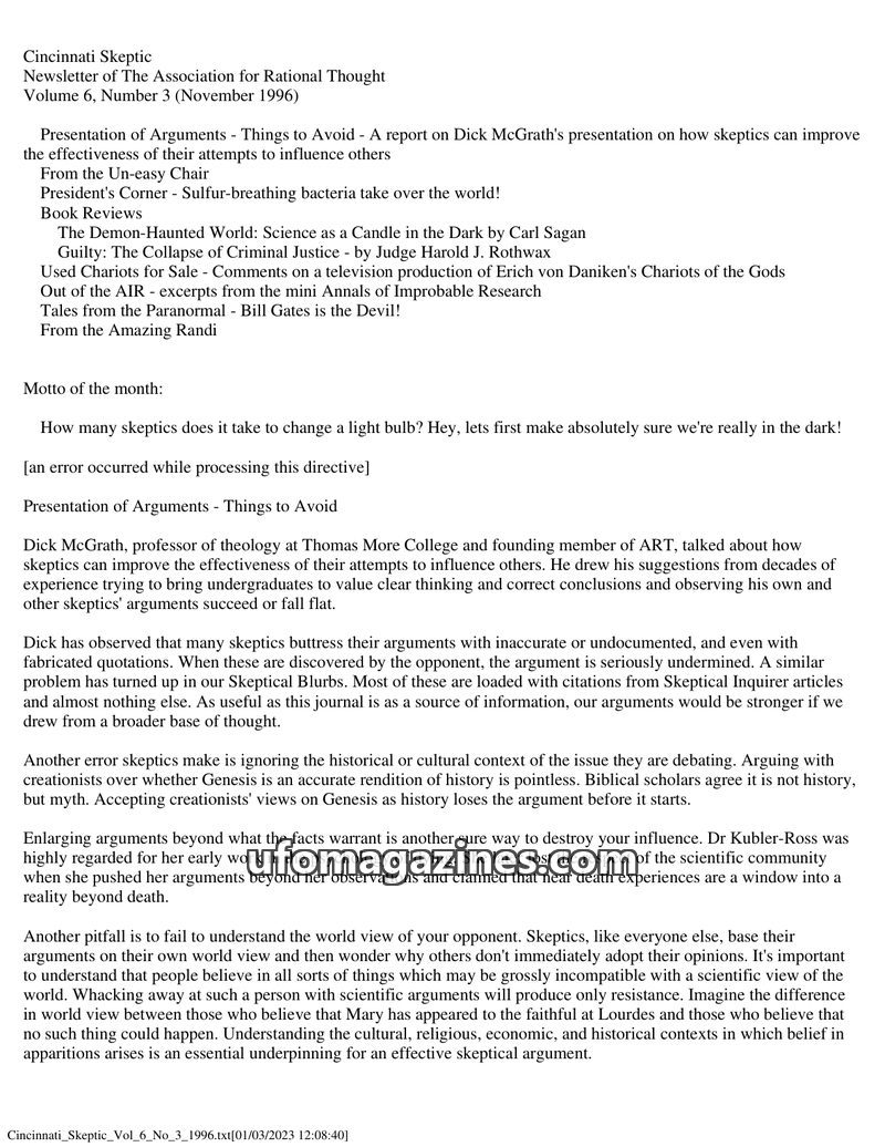 This issue of Cincinnati Skeptic focuses on improving skeptical arguments, with a report on Dick McGrath's presentation. It includes book reviews of Carl Sagan's 'The Demon-Haunted