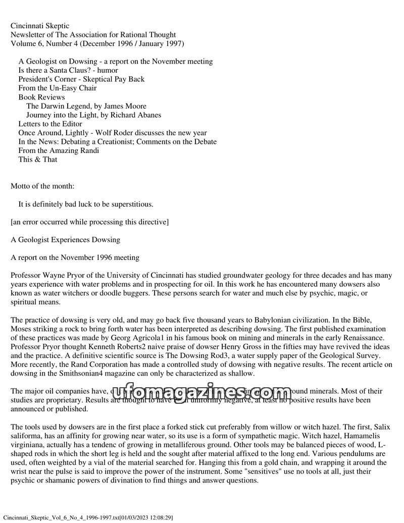 This issue of Cincinnati Skeptic explores dowsing from a geologist's perspective, questioning its scientific validity. It also presents a humorous, data-driven analysis of the logi