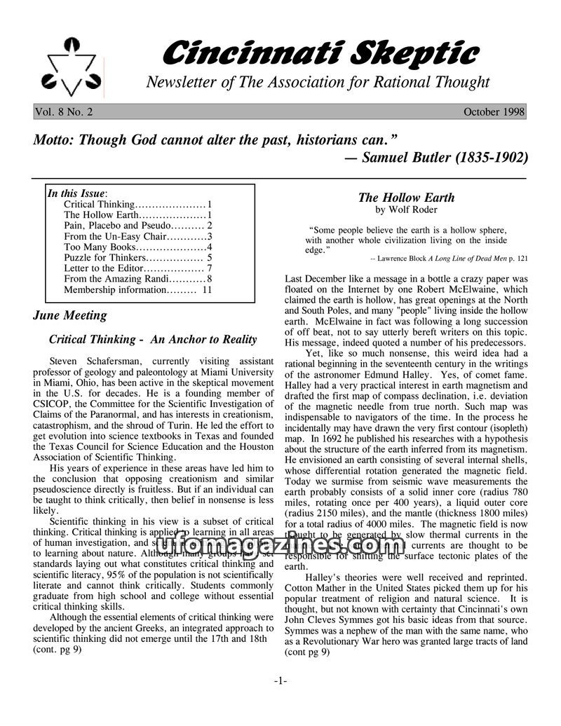 This issue of Cincinnati Skeptic covers critical thinking as an essential skill, exploring its historical development and modern application. It delves into the 'Hollow Earth' theo