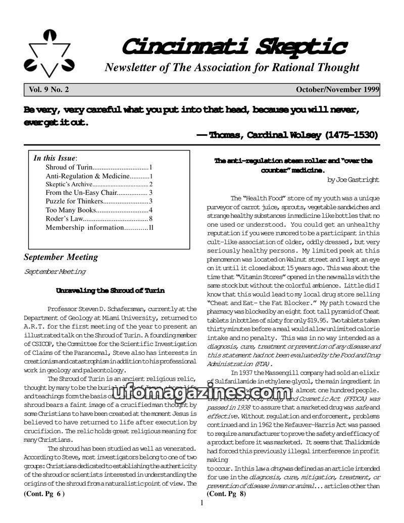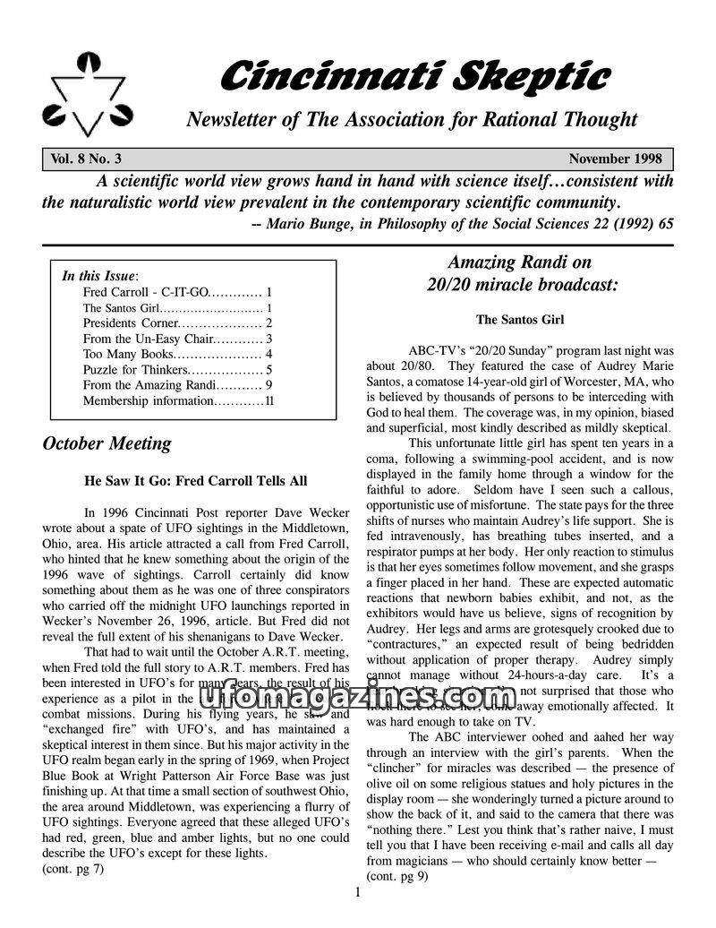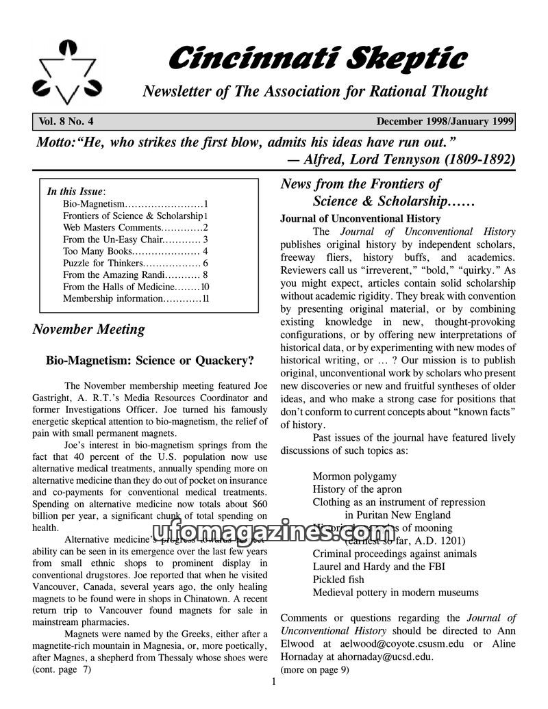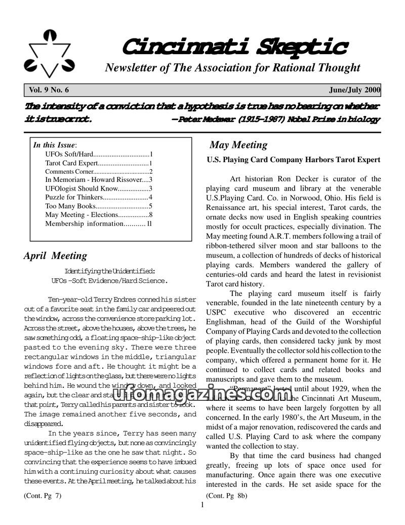 This issue of Cincinnati Skeptic explores various topics including UFO investigations, the historical origins of Tarot cards, and the development of alternative medicine in the 19t